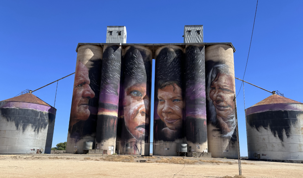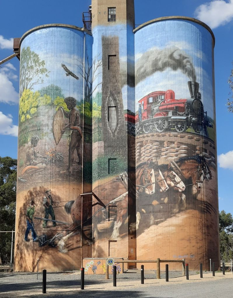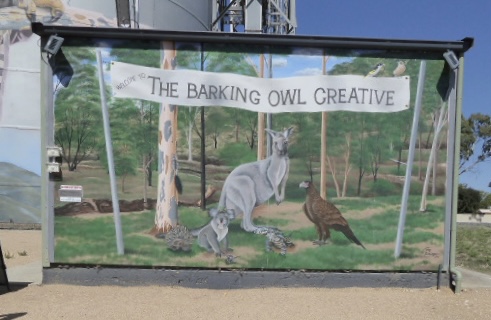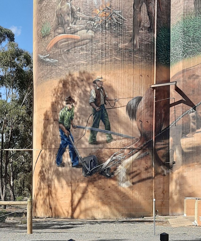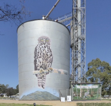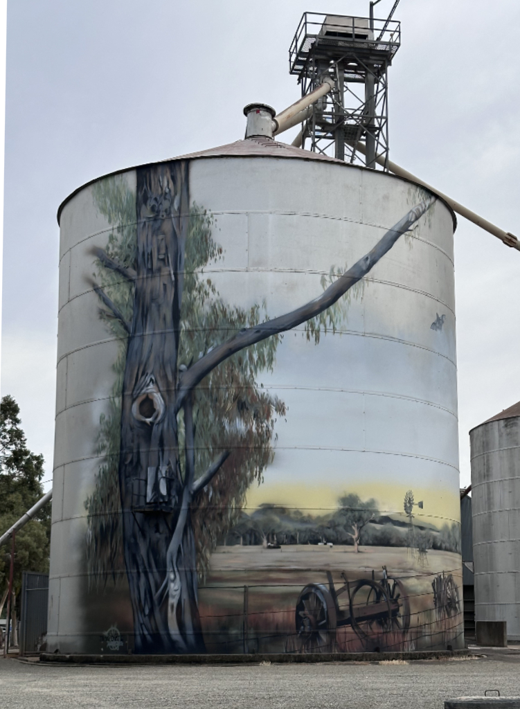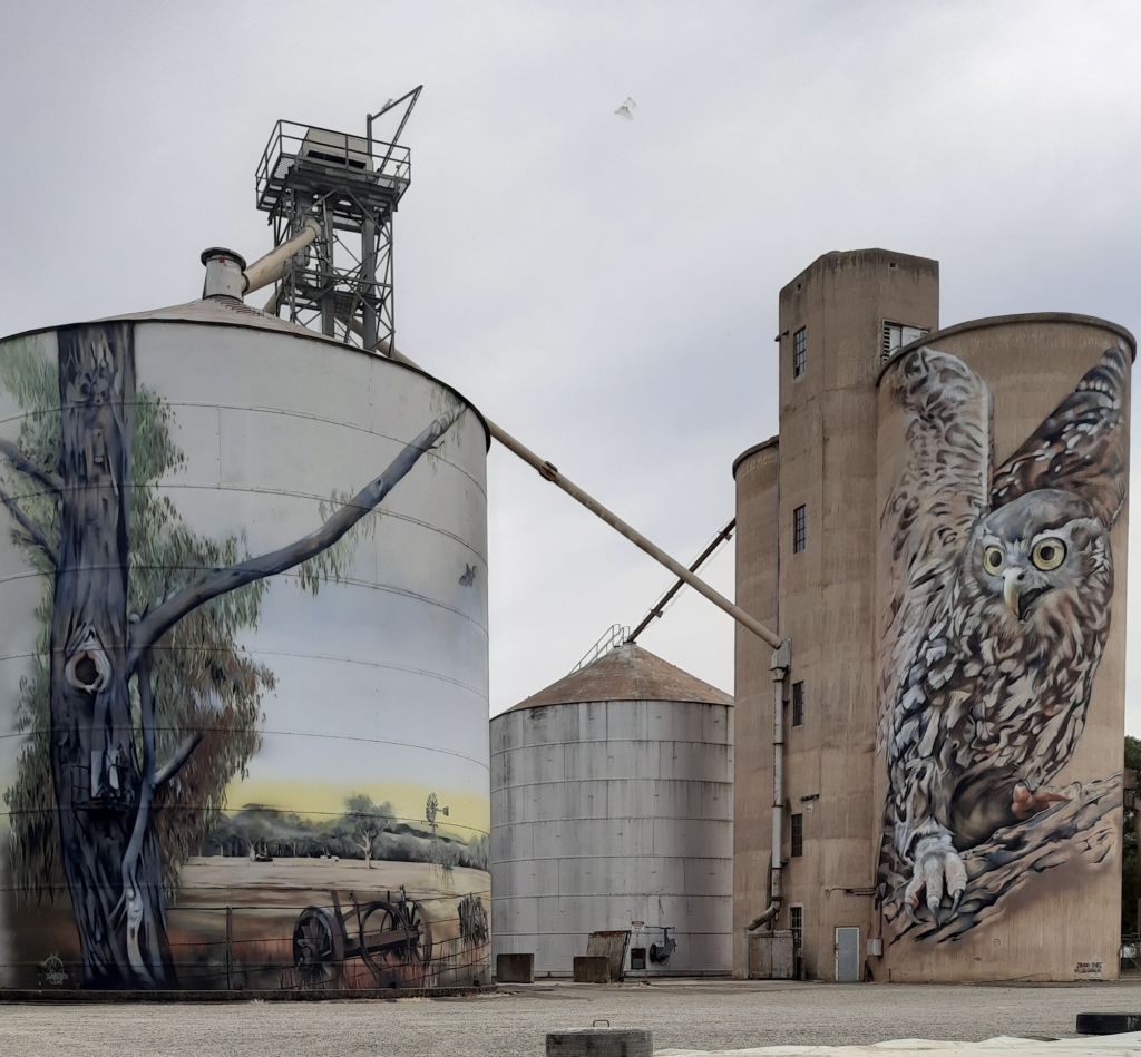 For the final stop on our Silo Art Mural Trail, we visited the small town of Goorambat, at silo complex there we saw three painted silos, in 2018 Jimmy Dvate painted Milli, a Barking Owl who lives at a nearby wildlife Sanctuary, in addition to a farming scene on one of the short silos.