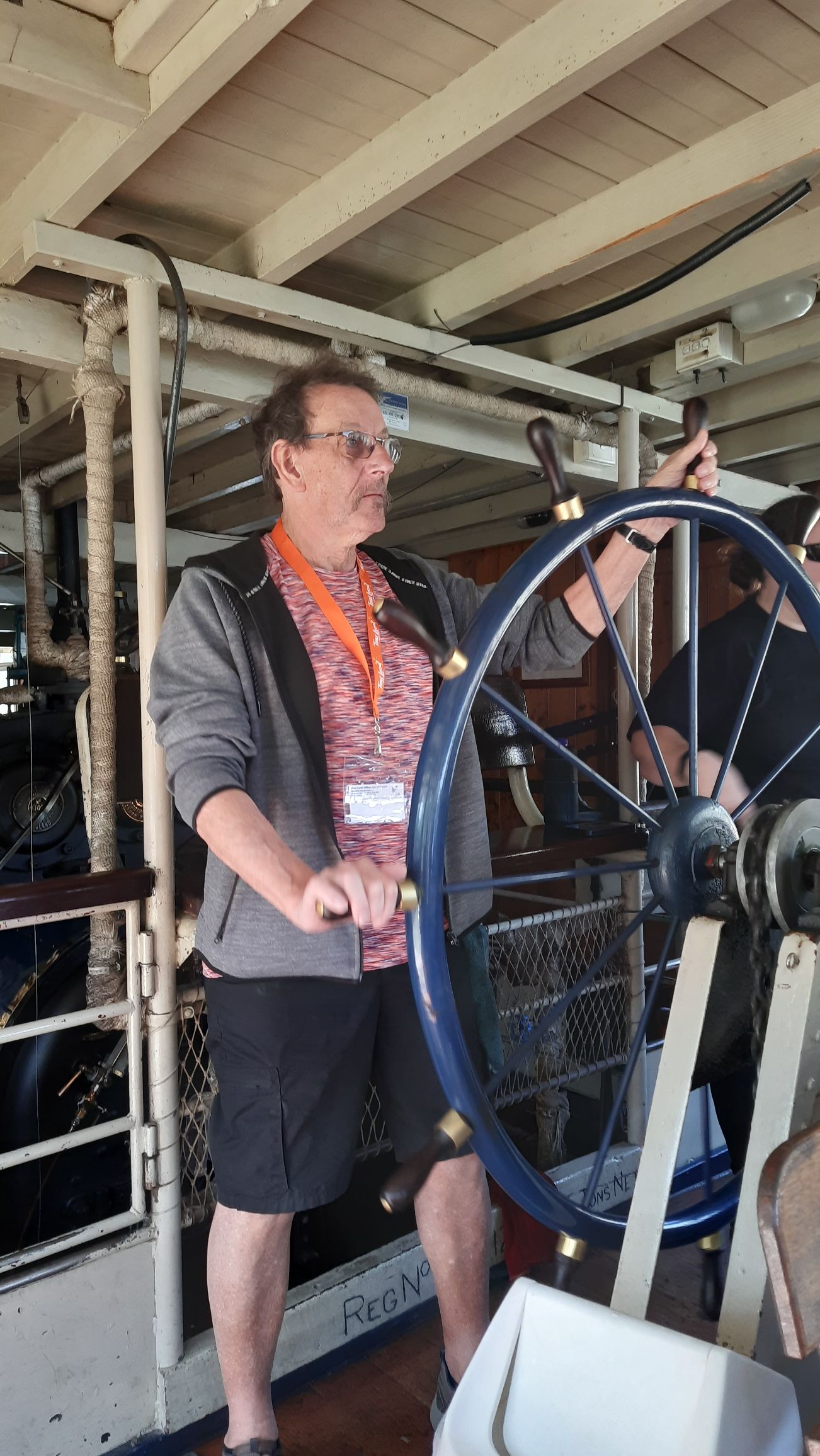 We had a leisurely start to the day today, our breakfast was in Beechworth’s, a local bakery along the street from our motel, their big breakie roll was truly wonderful and a great start to the day. I was truly surprised to notice a large mural across from our hotel on my way to breakfast, I discovered that it was painted in 2021 by Shaun Devenney, another Glasgow based artist. We then took the coach down to the Echuda Dock to board the PS Canberra for our cruise down the Murray River. The PS Canberra, a 110-year-old paddle steamer powered by a 1923 wood-fired steam engine, was a great way to see the river and a great addition to our trip, it was like being on a miniature version of our PS Waverley, I even got a chance to put my helmsman skills to the test.