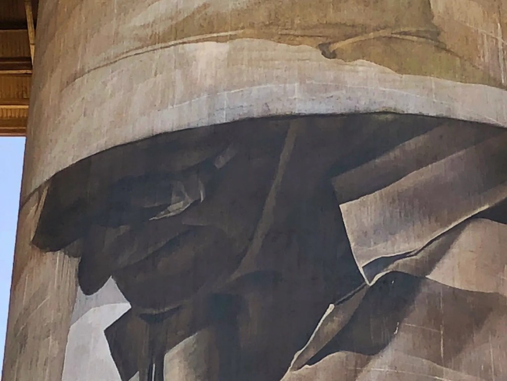 The two tall silos were officially unveiled on Anzac Day in 2018, to celebrate the 100-year centenary of the end of the First World War and depicts an image of a WW1 nurse and a modern female military medic in the Australian Armed Forces.