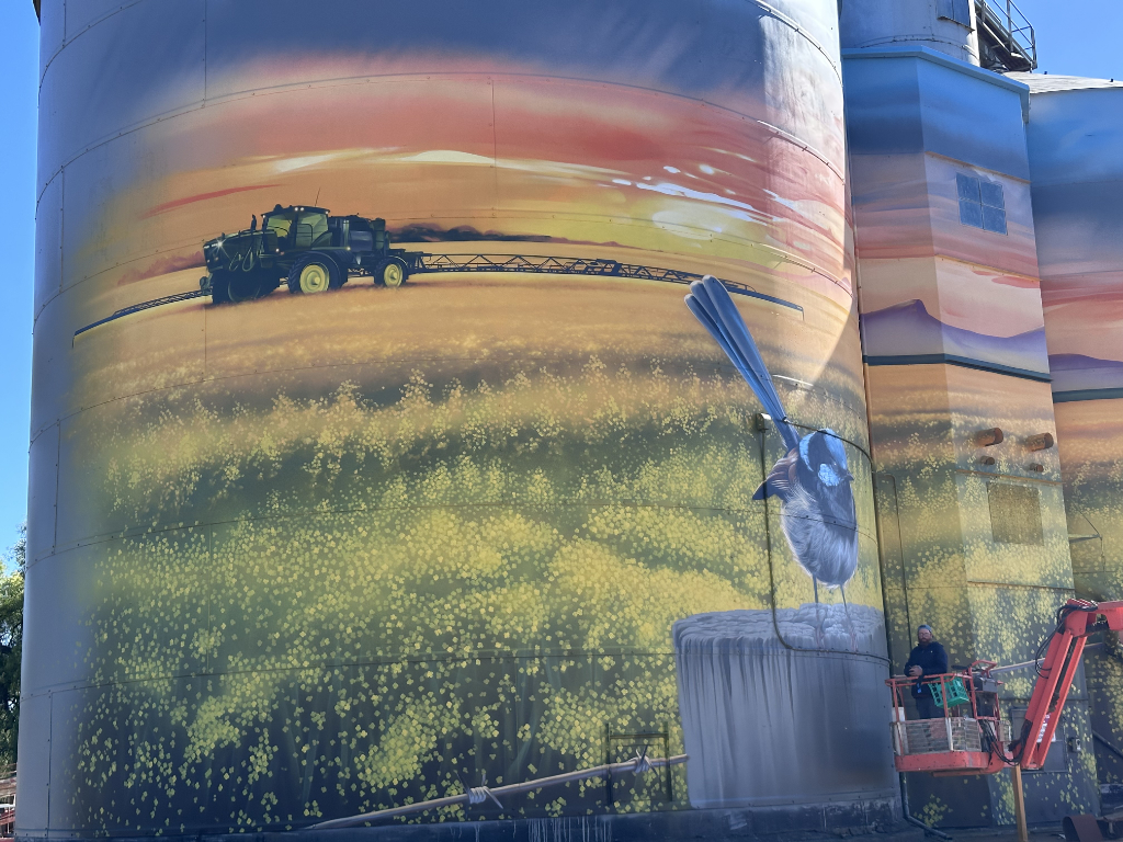 Our next stop was Rapanyup intending to see the murals by Russian artist Julia Volchkova which I first saw in 2023. But, by some weird coincidence Smug was there painting over them with a stunning mural showing the nearby canola fields. It was really good to meet with Sam and to watch him work as many of the others in the group were asking how the murals were created. I much prefer the new mural, but perhaps I am prejudiced as I know Smug and love his work.