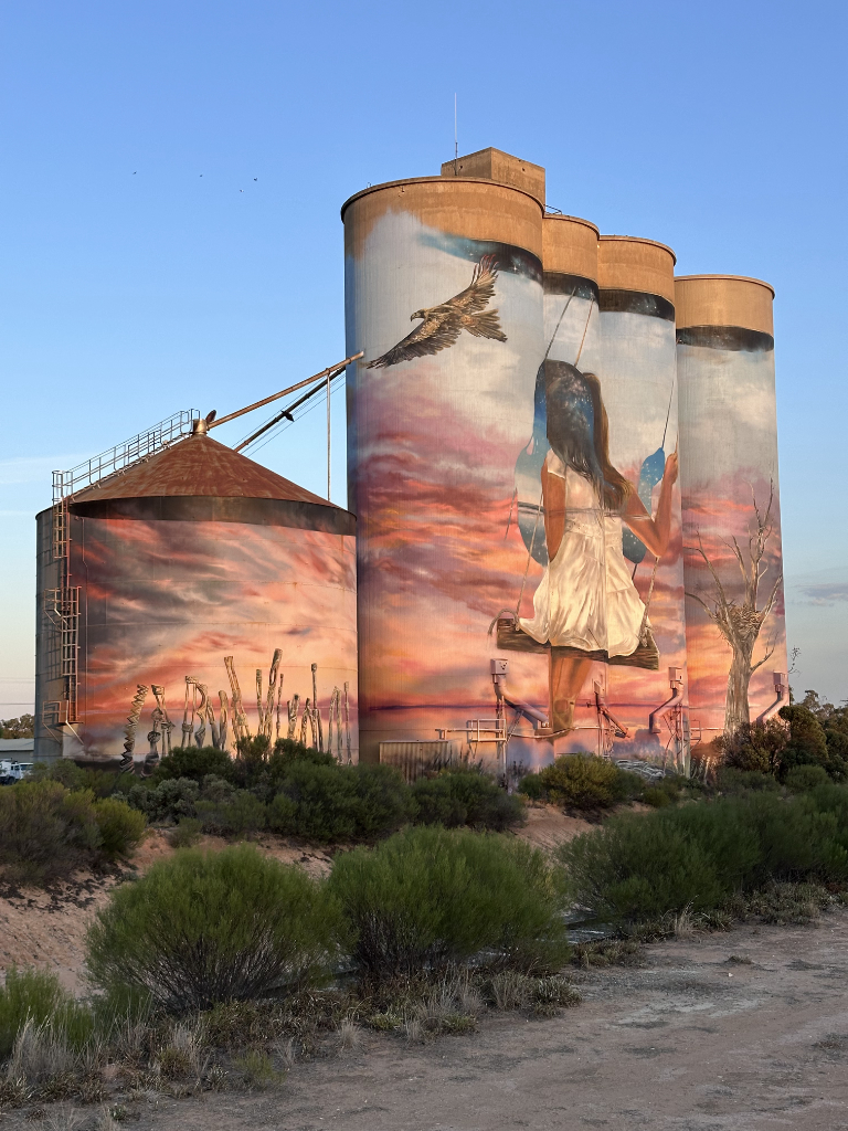 Our tour got off early as we popped round the corner to view the Sea Lake silo murals painted by Joel Fergie “The Zookeeper” and Travis Vinson “Drapl“, who also created a number of murals around town. These silos show a young girl swinging from a tree while looking out over Lake Tyrrell, with a large Eagle soars above her.
