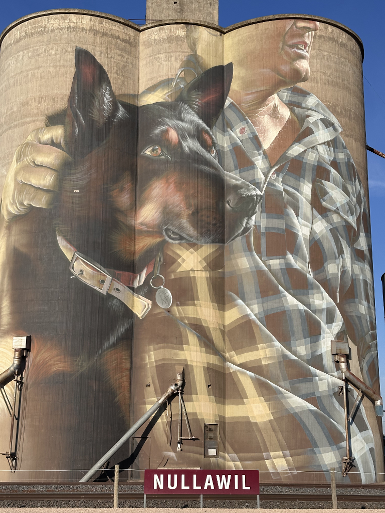Our next stop at Nullawil delighted us with yet another excellent mural by Smug this time depicting Jimmy the Kelpie dog sitting with his owner Darren.