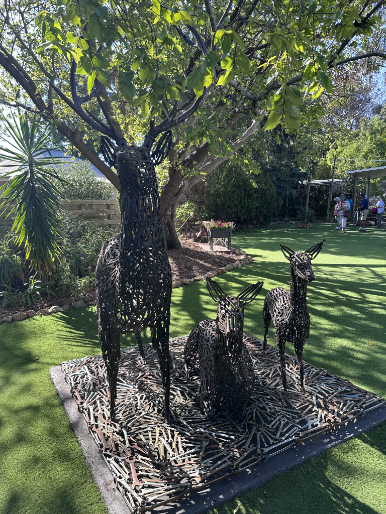 Just like our stop at Woods museum, we keep finding fascinating places to visit, this time it was to the Spanner Man of Boort. Displayed in a beautiful country garden are over 25 unique life size and larger than life sculptures, including an iconic shearer, a family of deer, a pair of fighting stallions, a mallee bull, intricate garden seats and many more. John Piccoli made the sculptures by welding together antique through to modern day spanners. The tallest sculpture, “ The Marlin”, is over 7 m tall, weighs 1200 kgs and is made from 3500 spanners. On arrival we were met by Andrew, the son of John, who showed us a video of his late father explaining how, as a young polio sufferer in a wheelchair, started creating art and sculptures from something as simple as spanner’s. The grounds surrounding the main house were full of his spectacular sculptures, all created using all types of spanner’s, old farming equipment and vehicles from all ages. It was a truly wonderful place to stop and spend some time.