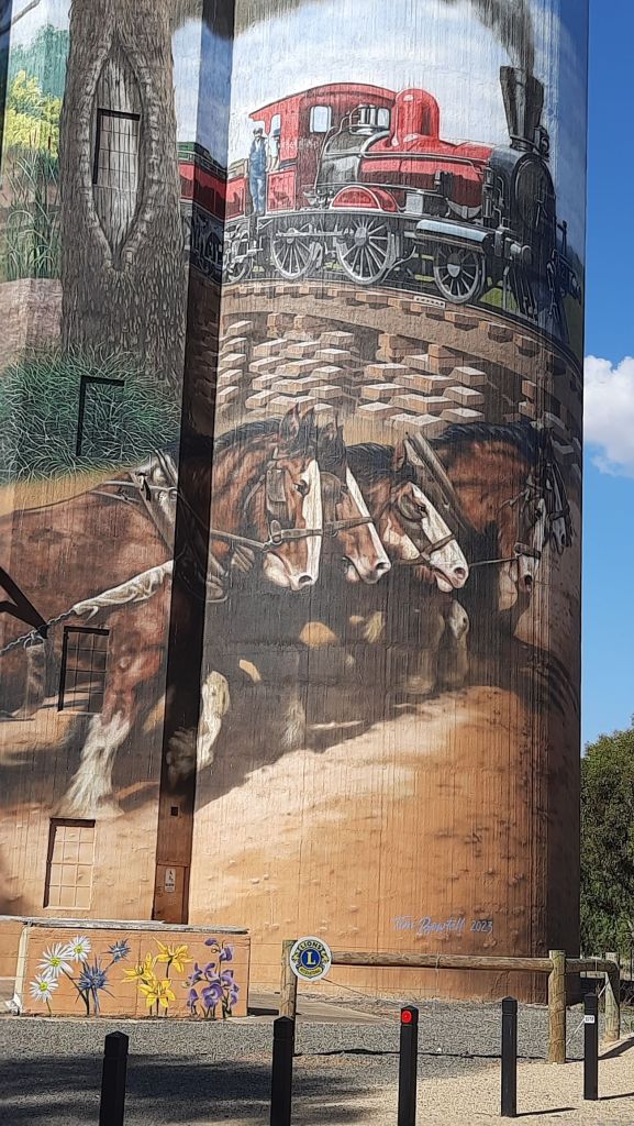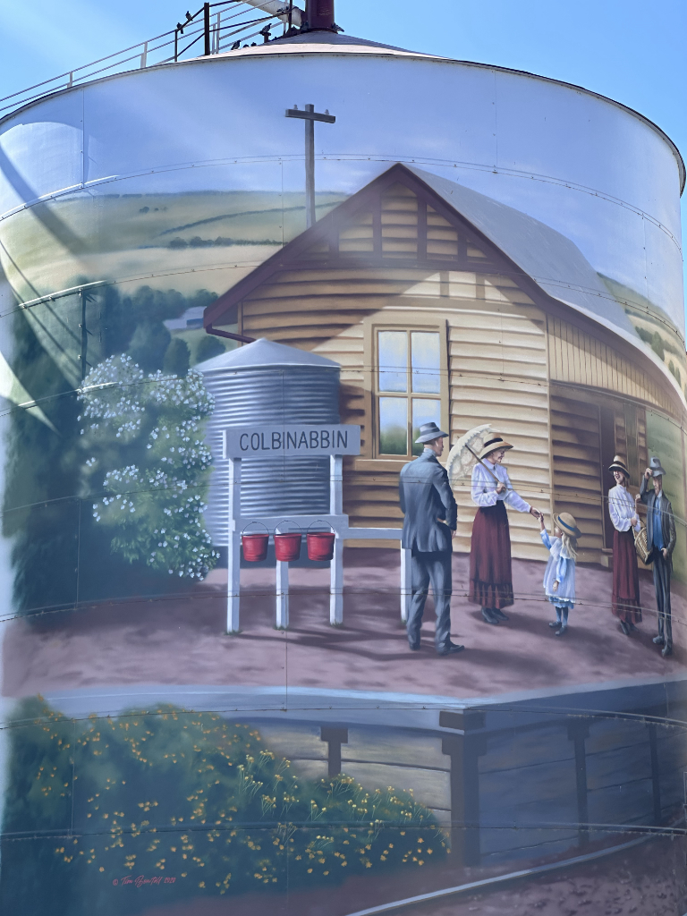 Colbinnabin was our next stop to see a set of silos painted by Tim Bowtell, Tim’s style, technique and materials appeared to be different to those we have seen previously, but comes together to create stunning pieces highlighting life in the area in times gone past.
