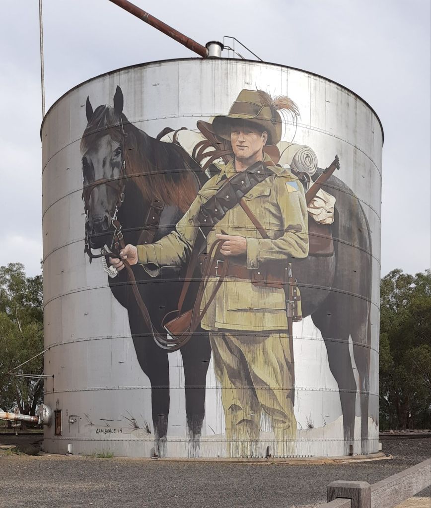 The shorter silo was unveiled one year later on Anzac Day 2019. This mural is a tribute to the Australian Light Horse, who served in the Second Boer War and WW 1. In addition to the silo art, there are also two fine murals by Tim Bowtell in the village with a military theme.