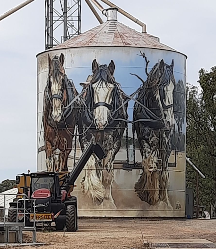 In 2019 Jimmy returned to paint another short silo is a magnificent tribute to three Clydesdale horses Clem, Sam, and Banjo. Jimmy has captured the motion of these horses in gallop, feathers flying on their feet as they travel side by side in harness.