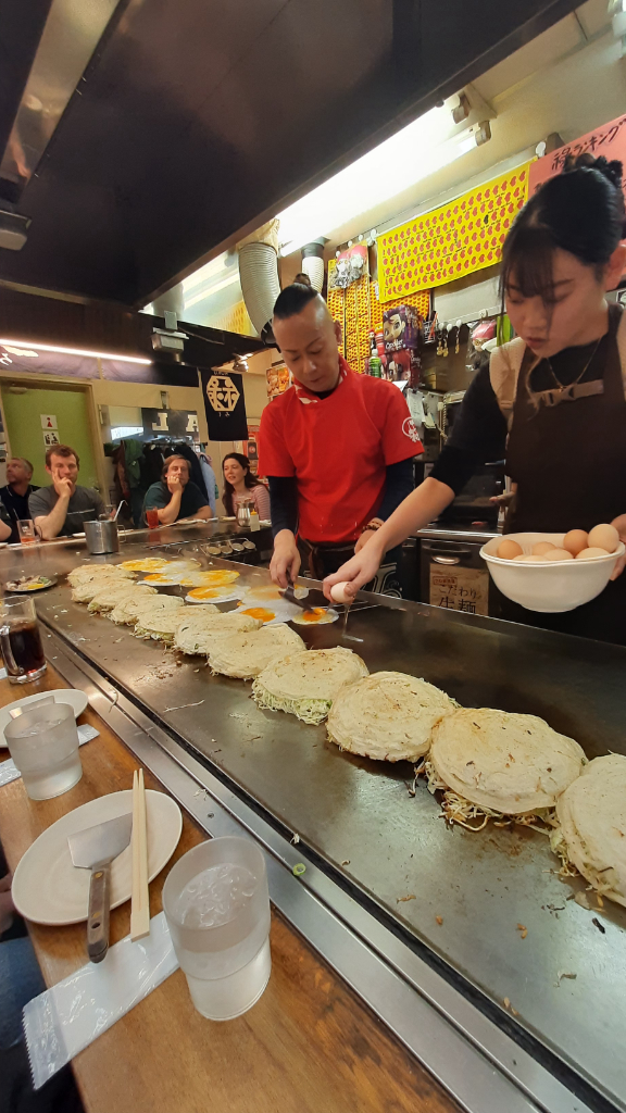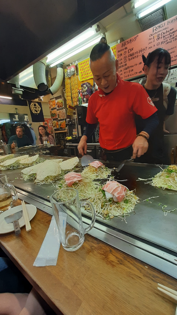 On our return from the museum, we were able to check into the Comfort Hotel, and another small but perfectly formed room, before going to visit Okonomimura for an Okonomiyaki dinner. Okonomiyaki is a savoury pancake with loads of cabbage, bacon, noodles and egg cooked on a teppanyaki grill. It was great fun watching the couple behind the grill cooking it all, they had it down to a fine art (if you look closely at the photographs, you may notice that she has her baby on her back while she was cooking), another great day in Japan.