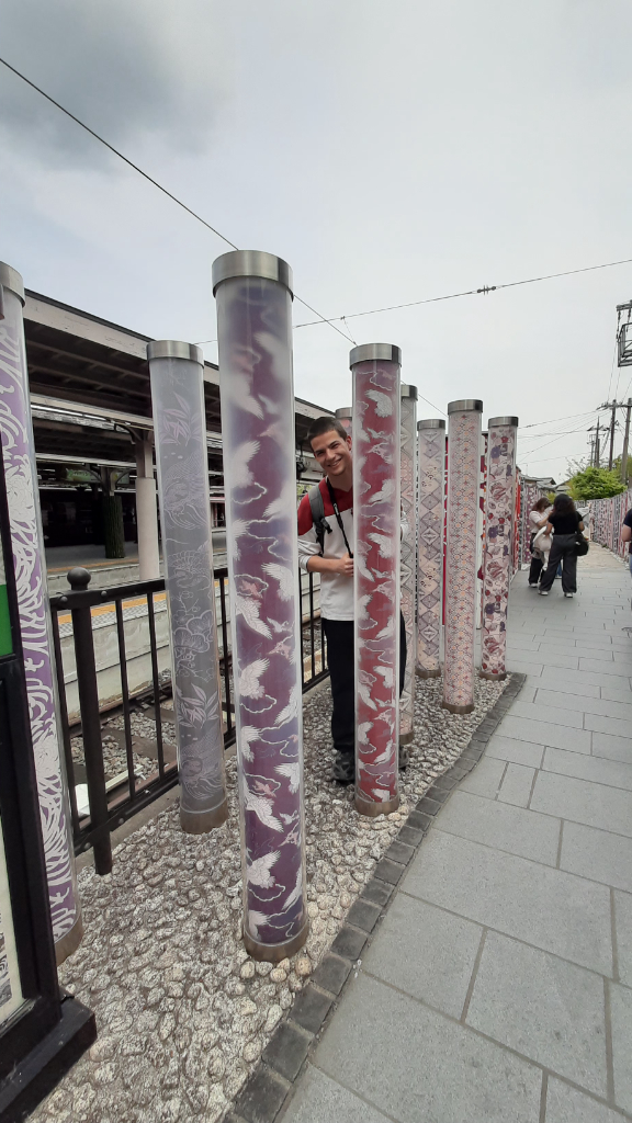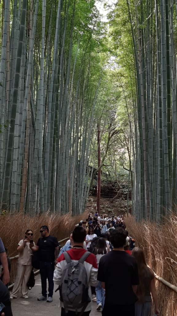 The Arashiyama Bamboo Grove was next on our list, and there was no way to avoid the massive crowds here, as this is also listed as one of Kyoto’s top sights. When you stand among the towering stalks of bamboo, it is like being in another world. Before we could get there, though we had to pass through a ‘Kimono Gate’ in the railway station, this collection of kimonos in glass columns was very colourful and fun.