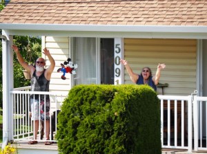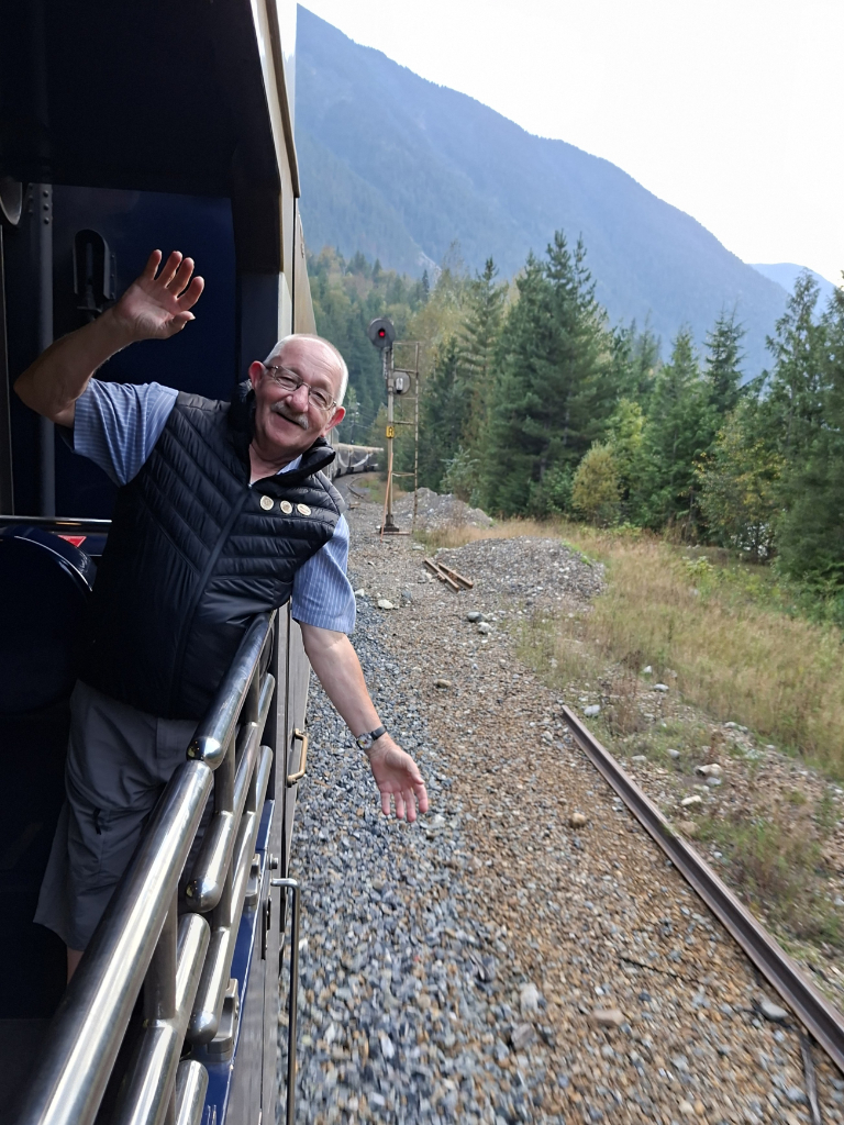 When we were passing through towns and villages along the way, it was really good to see people being excited when the train passed through. People were holding up children so they could see the train. People were running out of their homes to the trackside to wave. One pair of fans, Robert told us, is Doris and her husband Brian, who greet the train each time it passes their house, near the town of Canoe. He told us that the Rocky Mountaineer staff became so fond of Doris’s big, joyful waves that when they discovered that they had an approaching anniversary, they invited them on board for a trip to celebrate. They then sent Rocky Mountaineer staff to wave at them as they passed their own house. It was eventually discovered that it was their dogs who could tell from the sounds and vibrations of the Rocky Mountaineer trains that alerted them when they were approaching. Right on schedule, there they were, standing on their back porch, wildly waving at us as we passed. As you can imagine, we were all just as wild with our returning waves.