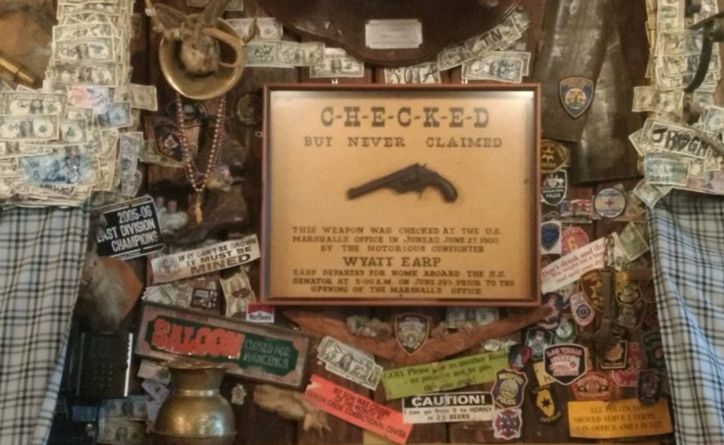 Later in the evening, in an effort to get out of the rain, we visited the famous Red Dog Saloon. This was a great fun place, a true dive bar with sawdust on the floor, good beer, and a gnarly old guy singing country songs, and a black bear chasing a guy through the ceiling. They also claim to have a pistol that belonged to Wyatt Earp, one of history’s most notorious gunslingers. How true the story is debatable, as there is also a notice in the Imperial Saloon saying that they took his gun from him.