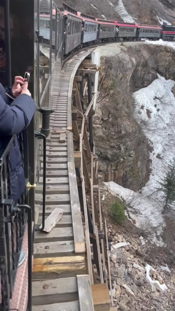 Back on the bus after lunch, we returned to Skagway to board the 1898 White Pass Railway, which took us up the treacherous pass the original prospectors had to undertake on foot while heavily loaded with supplies, eventually, after passing back through customs and passport control, back into Canada, to reach Fraser, British Columbia. The trip took us through mountains, tunnels and glaciers, often above the clouds, in restored old railcars complete with a log-burning stove in the corner. The commentary given during the trip was very entertaining and informative. Once in Fraser, we were happy to get away from the cold weather by re-boarding our bus for the return journey, back into the USA and Alaska, on our way back down to Skagway.