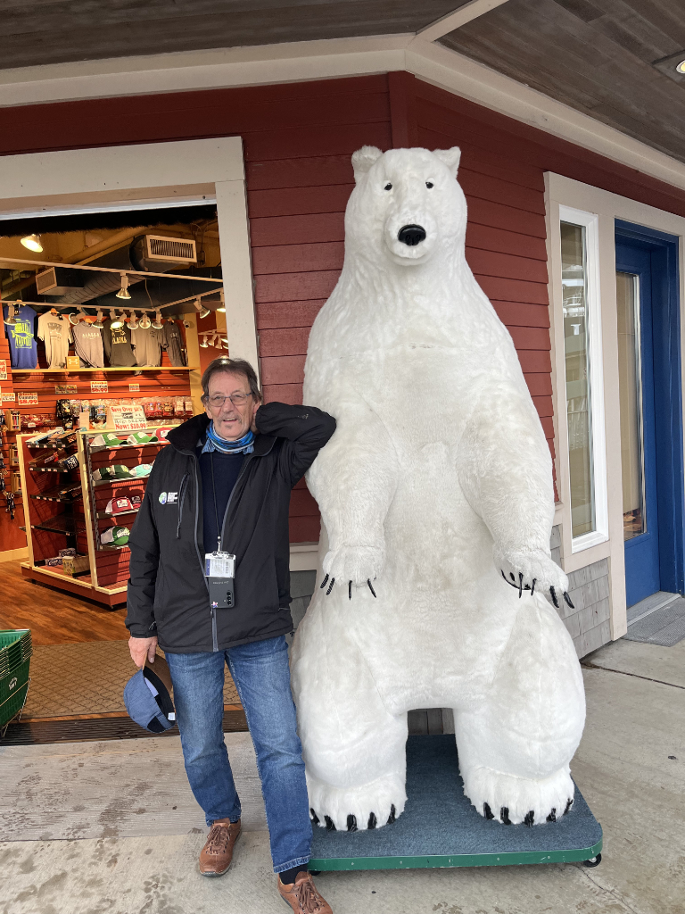 We were at sea all day, cruising down the Endicott Arm, a deep fjord which led to the stunning Dawes Glacier, the captain had opened up the bow section of the ship so I took the opportunity to get up close to the glacier, fortunately not too close that I was required to wear my thermals, although the decks were very wet and slippery. The views of the glacier and the bergy bits (large lumps of ice that had calved from the glacier) were a little of what we had come to Alaska to see. After reaching the glacier at the end of the fjord, the ship was turned around, and we continued our voyage South. We then spent the rest of the day having a relaxing time playing cribbage in the games room, then attending an origami presentation where we learned how to make a crab; it was great fun. Jim was highly delighted when we returned to our cabin to find that our steward, Riben or Ganan, had created a towel elephant sculpture for him. When it came time for a shower, he didn’t want to use his towels.