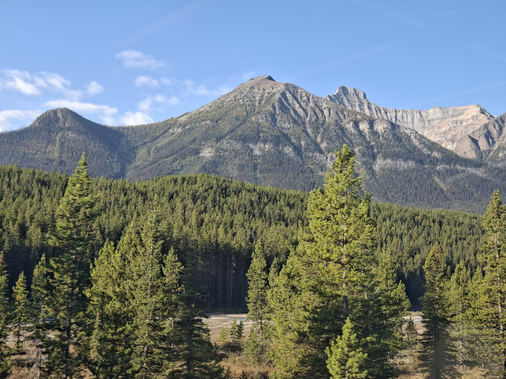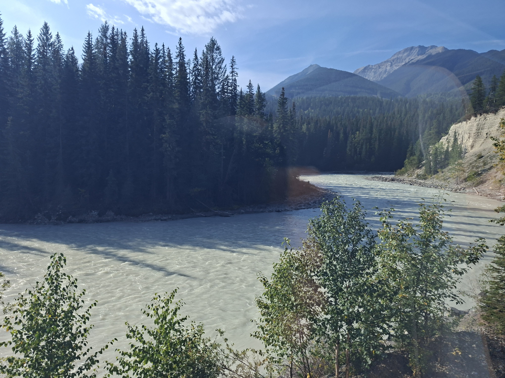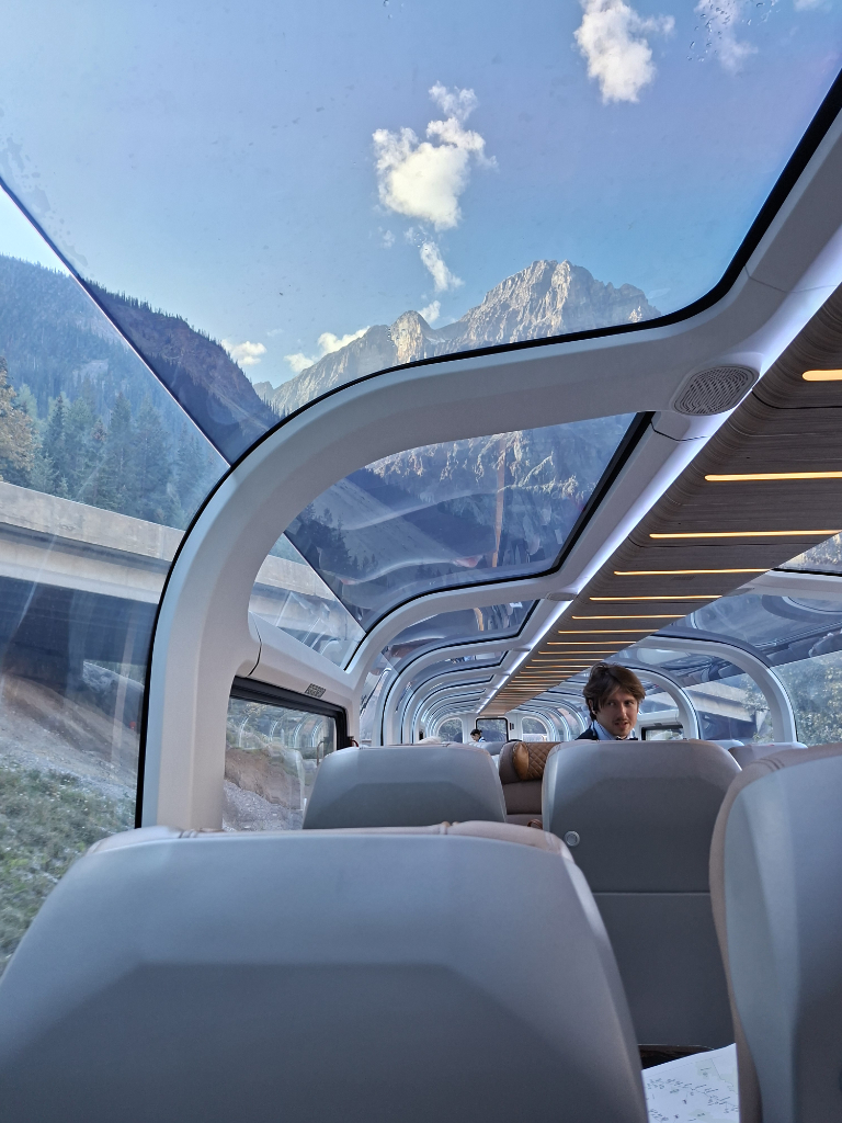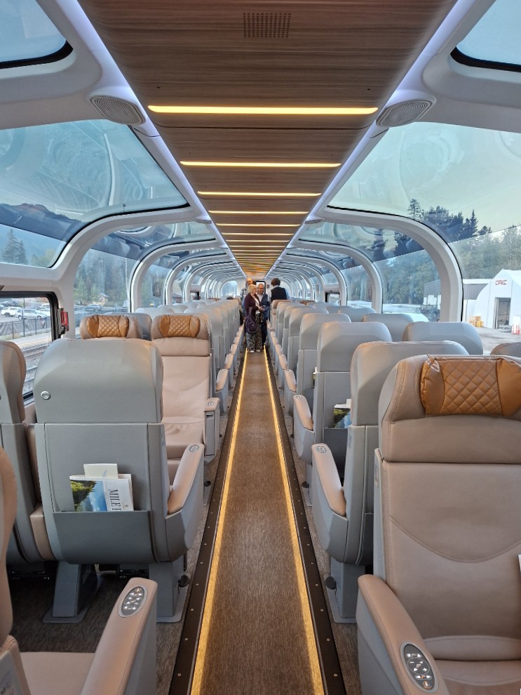 A special treat for us today, as we set off on our Rocky Mountaineer train on their “First Passage to the West” journey from Banff to Vancouver. As this is a private railway company, and there are no public access stations, we were collected at the hotel by the Rocky Mountaineer team. At this point, we said goodbye to our luggage before being taken by coach to their terminal in Banff, where we were greeted by our carriage hosts and invited to board car number 3 via a lovely red carpet, guided upstairs and shown to our very comfortable seats near the rear of the car, where we settled ourselves down and started exploring our environment for the next 2 days.
