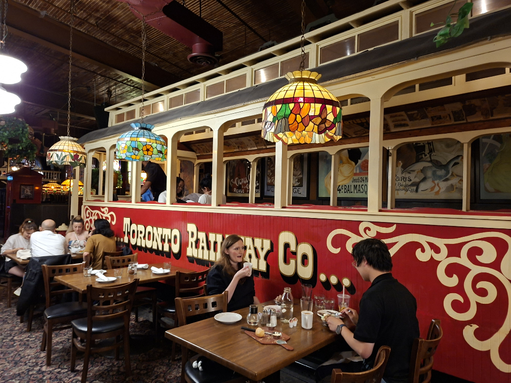 In the evening, the city was busy again with the Toronto International Film Festival, a Lady Gaga concert and the Blue Jays playing (yet another home match). We decided to give all of that a miss and visited the Old Spaghetti Factory for a lovely meal in some interesting surroundings, with carousel horses hanging from the ceiling, an old streetcar as a dining room, loads of stained glass and Tiffany-style lampshades everywhere, all adding to the ambience of the place. Their “All Included” menu certainly provided a good meal at a reasonable cost, making it well worth our visit. All too soon however, it was time to return to the hotel using the excellent public transport, tired but happy after yet another great day.