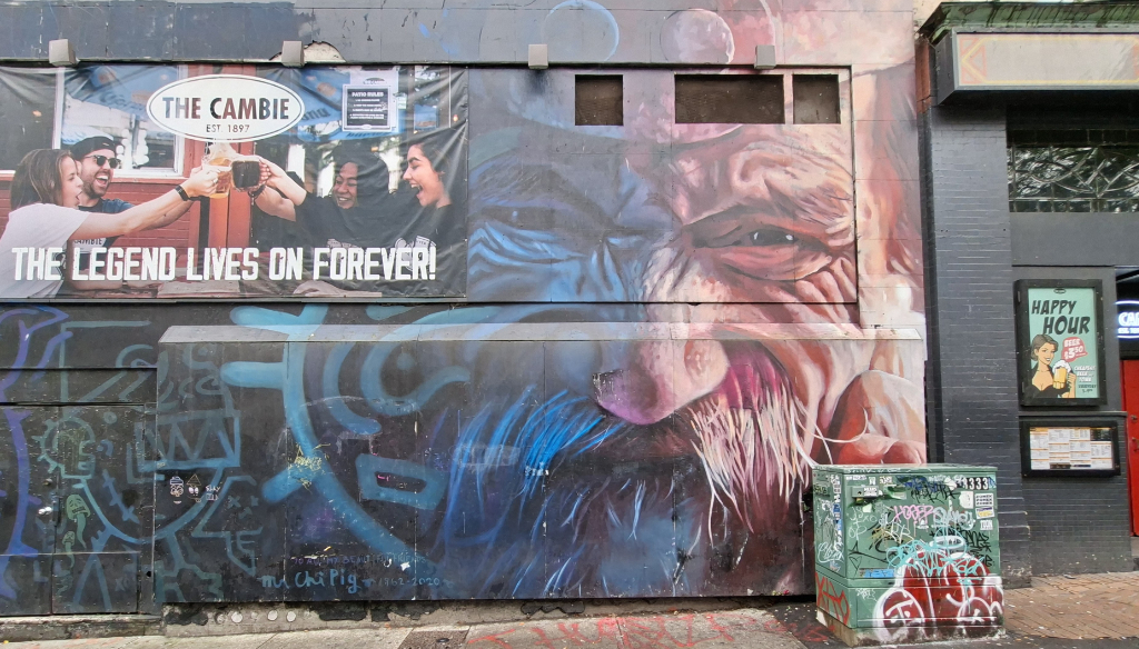 Despite trying to find The Lamplighters Tavern, reputedly one of Vancouver’s oldest pubs, open on many occasions, we elected to visit the second-oldest, The Cambie (1897), for lunch, which caused us a little bit of confusion, as The Lamplighters Tavern is dated from 1899 and is said to be the oldest. We found this bar to be an interesting spot with good food and beer at a reasonable cost. I especially liked the table tops painted by local artists. We decided to try out the local Skytrain on our return to the hotel, hoping to see some sights from on high, only to be disappointed when most of the journey took place in tunnels. Another local dinner and a couple of beers to end the day went down well.