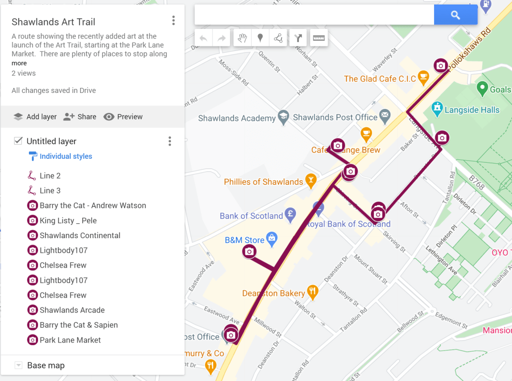 To enable visitors to the Shawlands area, I have created a route map showing where the artworks are situated, each of the pieces are show on the map with a red camera icon, clicking on the icon displays the mural, I have also included the locations of the previously created works.
