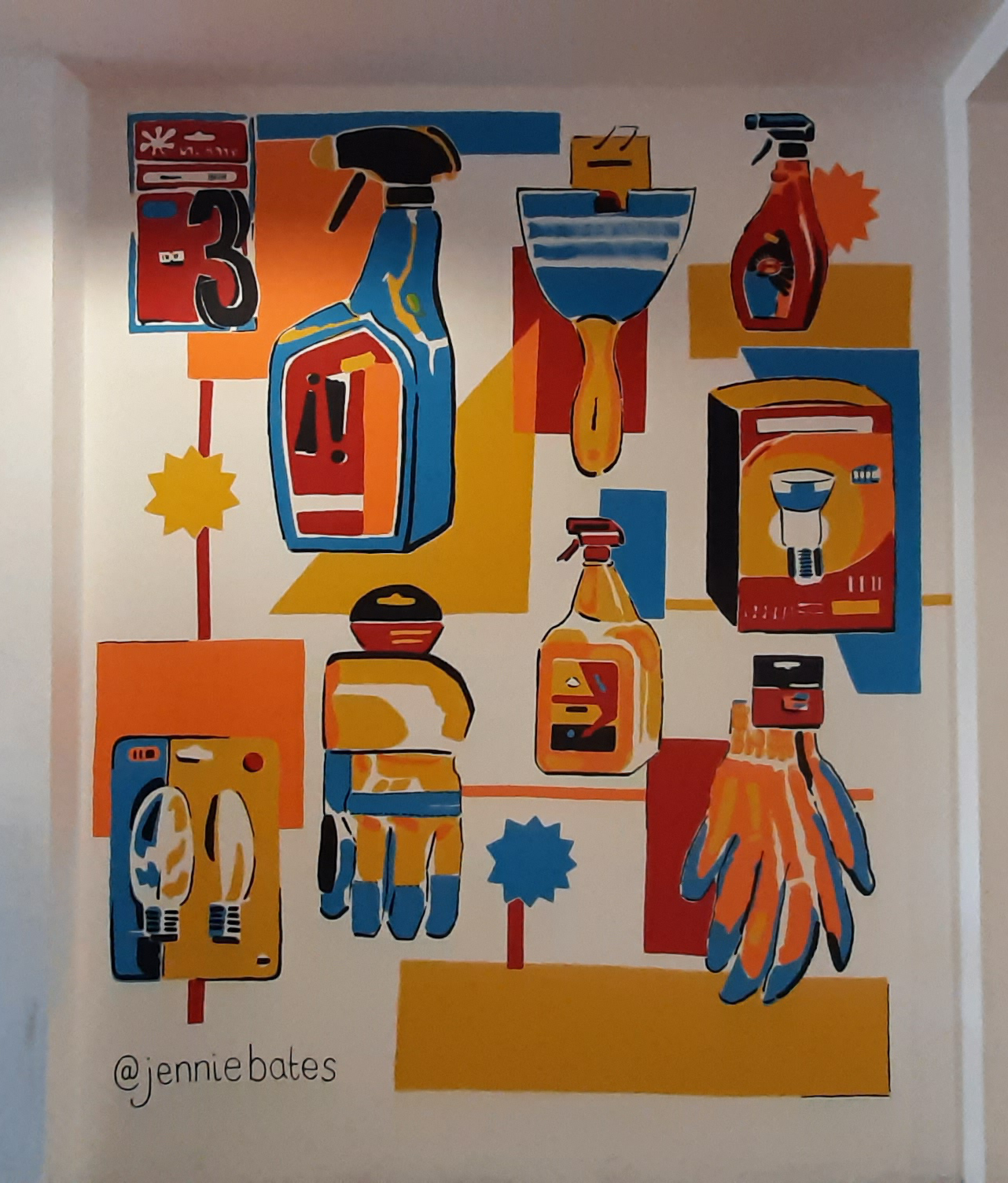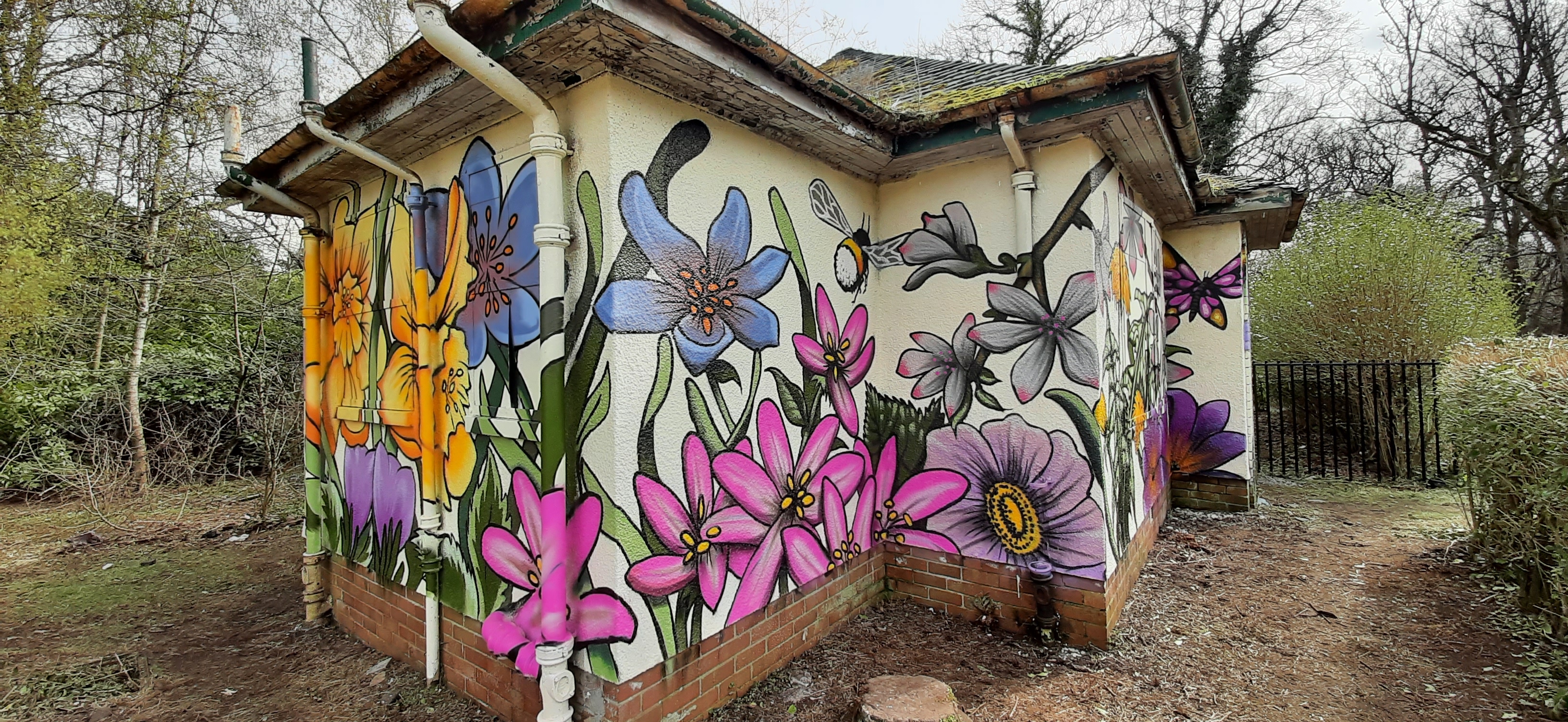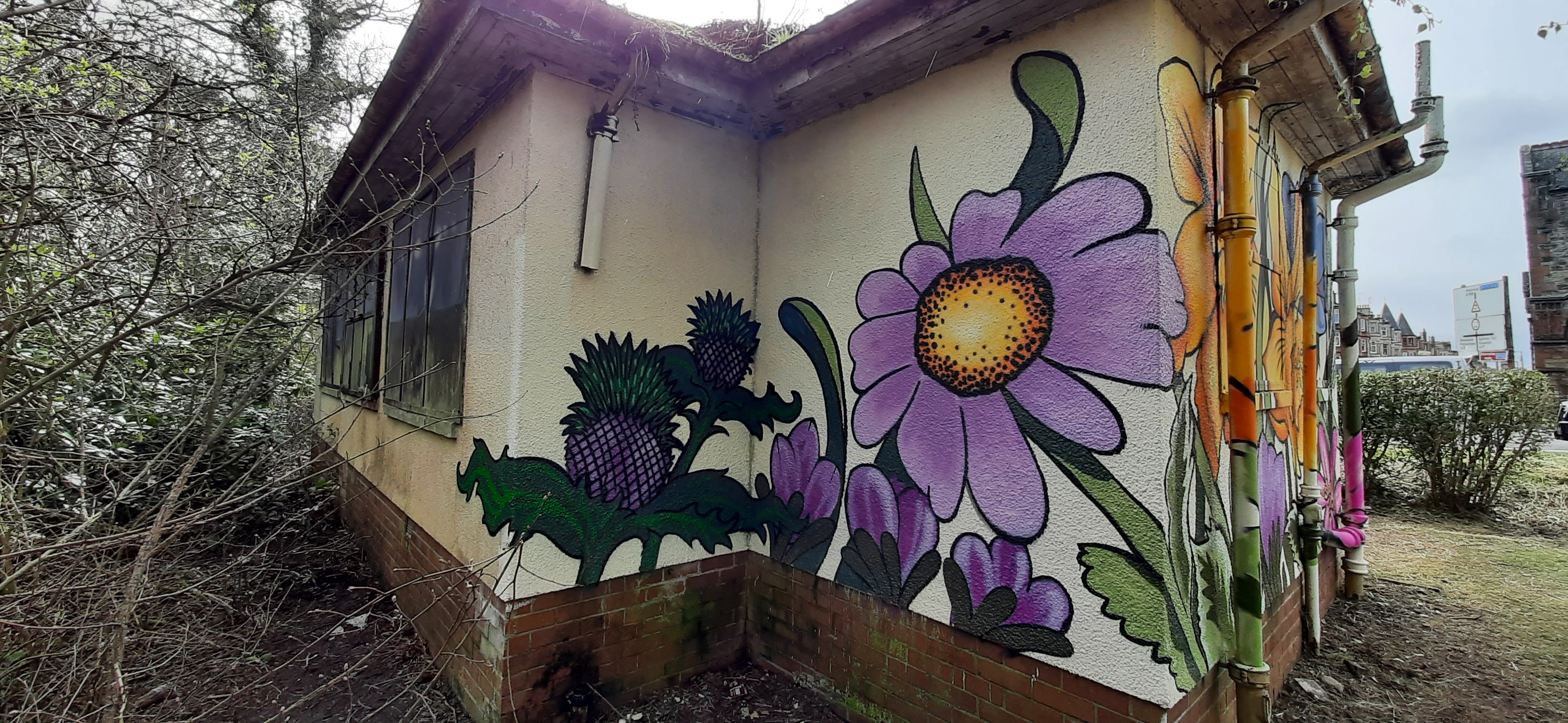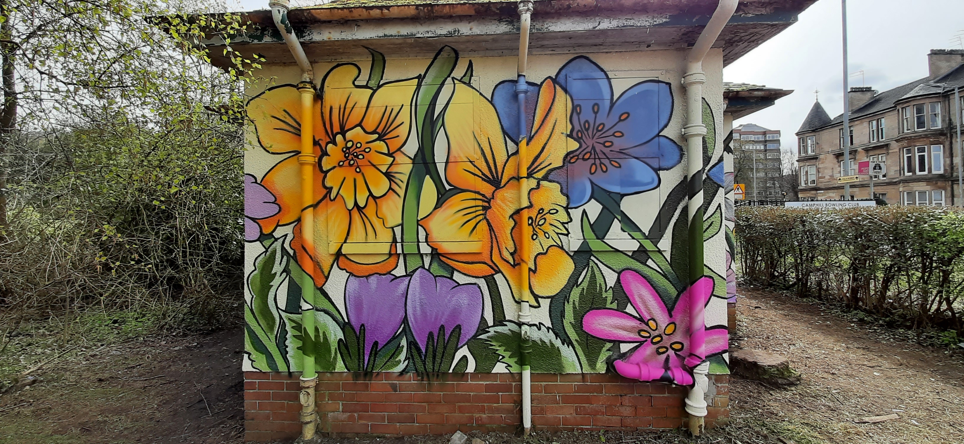 The artists working this weekend were Chelsea Frew at the side of Betty Beans at Trefoil Avenue, Lightbody107 at Ruby Woo’s on Deanston Drive, while Molly Hankinson, Little Book Transfers, Bosscitytaio, BmoreSketchy and MackColours were all working on the wall at the side of the Shawlands Continental supermarket on Frankfort Street. Meanwhile, Jenny Booth, Jennie Bates and Cocozza Aesthetics were painting away inside the Shawlands Arcade. Barry the Cat, a regular artist in the area was to been seen painting with Sapian on the old bothy next to the Camphill Bowling Club on Langside Drive, their floral piece, full of colour certainly brightens up a dull old building.
