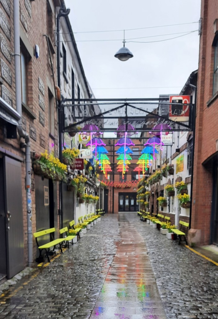 We caught the 8:00 train to Belfast again today, and after another late breakfast in the Bridge Bar, we set off hunting, this time our target was the street art of the city. A quick visit to the Tourist Information office provided some hints, so off we went walking. Starting off in the Cathedral Quarter we found many good murals and pieces of shutter art in the many entries and closes of the area, of course, we just happened to stop off at The Duke of York, a traditional Belfast bar crammed with original mirrors and memorabilia, boasting cold beer, great Guinness and one of the largest selection of Irish whiskeys in Ireland. The bar is situated in Commercial Court, which has become known as Umbrella Street due to the colourful neon brollies hanging over the street.