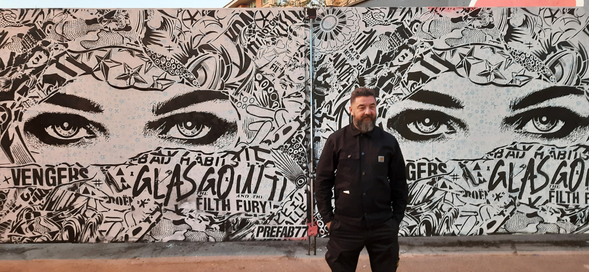 I took a trip into Yard Life at SWG3 last night to see the new exhibition by Prefab77 (AKA Peter Manning). A Slice of Life, which is Peter’s first solo Scottish show, is a stunning series of portraits in a mixture of print, acrylic, spray paint, wheatpaste and varnish which creates a dark world of Gangs, Goddesses and Groupies, woven into pure, rock and rebellion. I had a good blether with Peter, a thoroughly nice guy, who stated that he loves Glasgow and is looking forward to returning in June for Yardworks 2022, I would love to see him in action then.