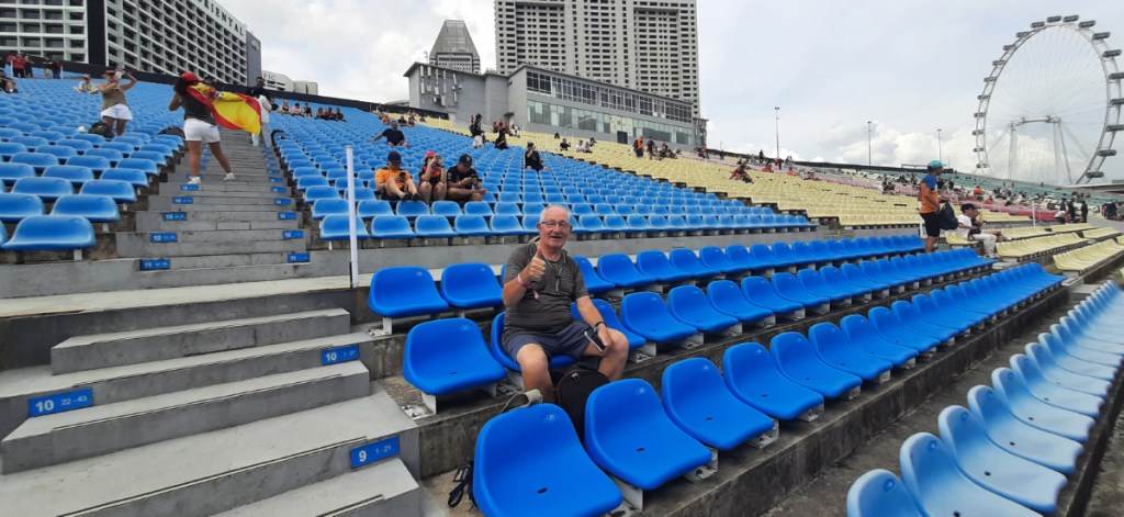 At this point, the heavens opened and we had a massive rainstorm, despite cagoules and ponchos, we couldn’t stay dry and, in addition to almost everyone there, we retreated to the area under the grandstand to shelter from the rain in the hope that it would eventually stop and the race be allowed to start. After a nail-biting hour, the rain stopped and the decision was made to start the race, so following the Singaporean National Anthem, it all got underway.
