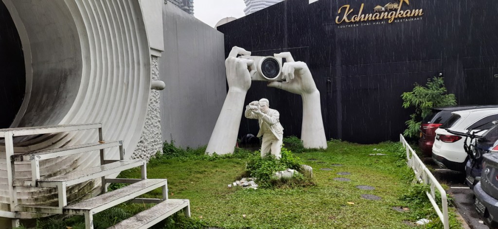 With time to spare after our cruise we thought we would visit Kampong Gelam, a neighbourhood known as Arab street, to see some murals by Yip Yew Chong, one of my favourite ever artists, again, nature took over with yet another rainstorm, this time, unfortunately, we were in a predominantly Muslim area so we couldn’t take solace in lunch or a beer in one of the malls, we sat it out as long as we could before trying a sprint to the nearest MRT station, we thought we had done well staying reasonably dry until a passing motorist going through a puddle completely drenched us. The murals did make the trip worthwhile though, and I did find a quirky camera shaped building that turned out to be a camera museum, unfortunately it was closed, which was a shame as it would have been a great place to shelter from the rain.