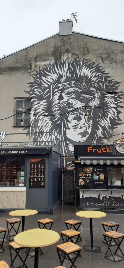 We then went down into the Jewish Quarter of Old Krakow, this area has a totally different vibe compared to the rest of the city, it was a bit more rundown looking, but it was interesting none less, it was the only part of the city where I found some street art. After visiting the Museum of Municipal Engineering to see some great exhibits, we visited the Andrus Food Truck which came highly recommended as a place for some Maczanka po Krakowsku, which is really great street food and a beer before crossing the river to visit Oskar Schindler’s factory, by this time I was feeling a bit played out, so Jim went on the museum tour whilst I stopped for a coffee.