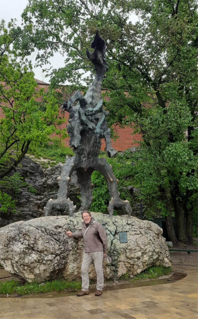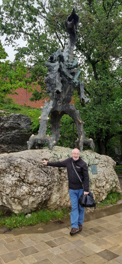A stroll into town for breakfast before heading back down to the Wawel Royal Castle for a better look around, despite it being rainy again it was good fun to see around with the knowledge we had gained on our tour yesterday this time, we descended 130 steps down into the Dragon’s Den, the dragon being one of Krakow’s symbols, exiting on the banks of the Vistula River where we came across a flame spouting dragon.