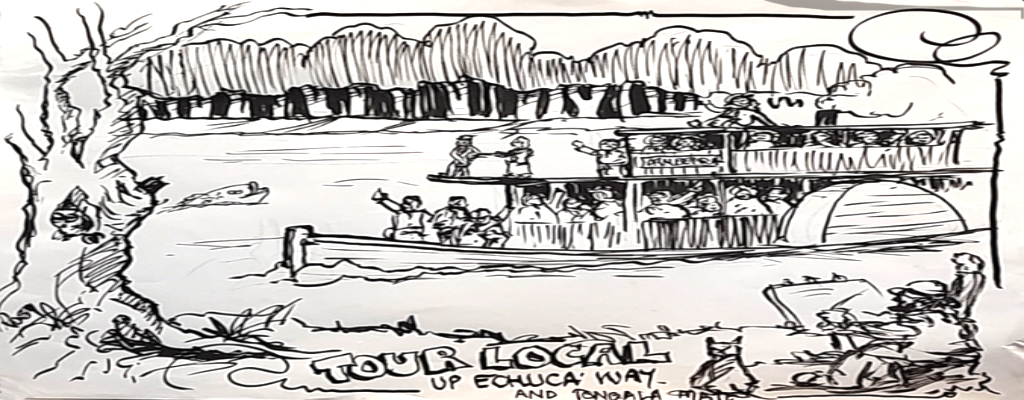 After our cruise, we made our way to the lovely little town of Tongala, a town which in 2021 was voted the #1 street art town in Australia, with over 50 murals, many painted by Murray Ross, a local who we met when we had lunch provided by the local Lions club. I took great pleasure in watching Murray drawing a fun sketch for me whilst I chatted to him, he then created a drawing of a paddle steamer on the river, which we all received a copy for at the end of our trip. Murray then boarded our bus and took us around the murals dotted around town, it was really good to meet such a talented and generous guy.