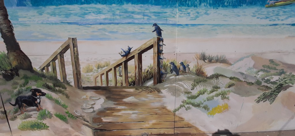 My birthday! Following on from yesterday’s walk, I decided to venture a bit further today, I went to Mordialloc and caught a train down to Frankston, the seaside town where Briony grew up. Jim and I visited last year with Graeme, Briony, Pat & Kay to take part in a street art walking tour, which was excellent, so I thought it would be good to do it again on my own. After visiting the library and the civic information centre, I eventually found the tourist information centre down near the beach, where I picked up a map showing the locations of all of the major pieces. (watch out for a page showing them all later)