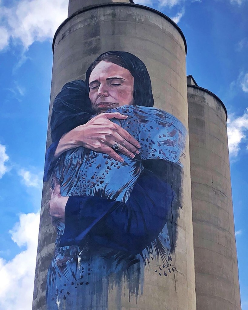 Today I went out mural hunting again, I started off in the suburb of Brunswick to see a mural on a silo near the railway station showing the outgoing New Zealand prime minister, Jacinda Arden, showing her embracing a Muslim woman, this was painted by Melbourne artist Loretta Lizzie, after the devastating Christchurch mosque attacks in 2019.