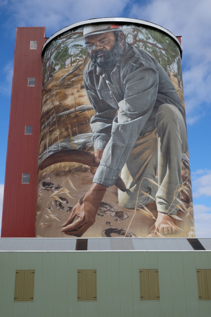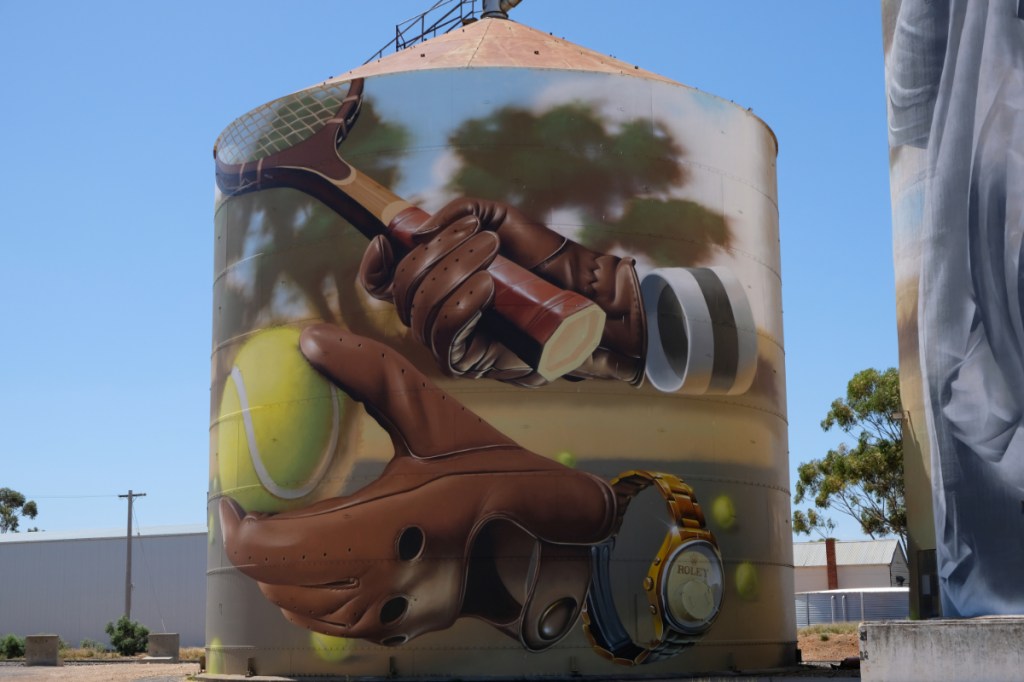 Our next stop was the sleepy little town of Dimboola, a stop on the way to Arkona, see another silo pained by Smug, this was a great place to have a coffee break and a chat with some of the locals in Oma’s Cafe, it transpired that Smug stayed in the town whilst painting the silo and while he was there he also painted a mural on a building next to the local library, this mural, a study of some local birds, was magnificent indeed. After our coffee, we went up the road to Arkona to see another stunning and interesting mural by Smug on the silo. The mural depicts Roley Klinge, an Arkona local who championed tennis for the local community. Being unable to meet Roley, who had passed away in 1991, Smug decided to paint him in an innovative way, showing only his clothing and tennis gear, however, he did manage to fit in a small portrait of him at the base of the silo. This truly is a spectacular mural that finished off our trail to perfection.