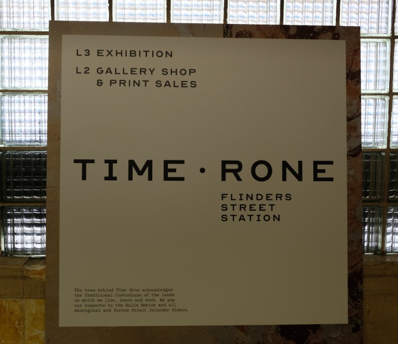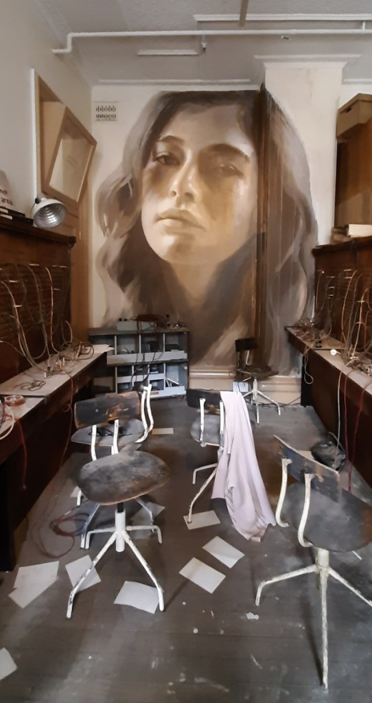Today, for part of my birthday, Graeme and Briony got me, Pat & Kay tickets to see an exhibition called Time, by the artist Rone, in a long-neglected part of Flinders Street Station. Rone, an international street artist from Geelong, whose works can be seen in and around Melbourne has created a unique space that takes you back to a part of the world where time has stood still for 70 years or so. Each of the 11 rooms tells its own story of a world that used to be – from deserted switchboards to the ghostly library, lined with hundreds of fictitious novels marked with the exhibition and its artist on their spines, the room with the sewing machines almost looked like the staff had just walked out after a day’s work and the room left neglected for 70 years.