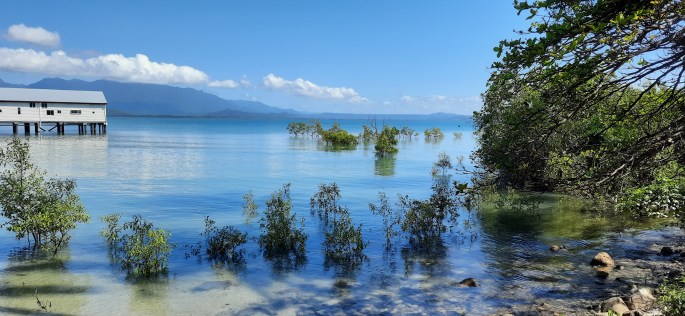 In the morning before breakfast we took a stroll down to the nearby beach, it was as spectacular as you would expect for North Queensland with miles and miles of pristine sand. A quick shuttle bus service took us into Port Douglas town where there was a local market running, we had a nice breakfast with some local food in the market before exploring the town. We eventually ended up at the marina where we were spoiled for choice on Great Barrier Reef tours, we eventually choose one for tomorrow then went for lunch in Paddy’s, a local bar, only to be served by a young couple from Glasgow. Back at the hotel we lounged by the pool, had a swim and relaxed with our books in the sunshine. Whilst in town earlier we did some shopping, which meant that we could have a nice relaxing dinner on the terrace outside our room with a glass of chilled wine to end this phase of our holiday.