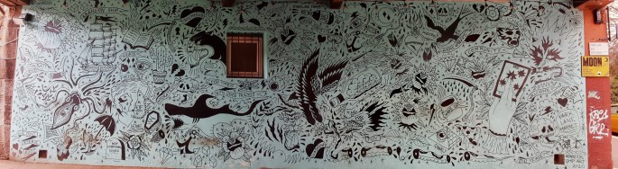 The artists working this weekend were Chelsea Frew at the side of Betty Beans at Trefoil Avenue, Lightbody107 at Ruby Woo’s on Deanston Drive, while Molly Hankinson, Little Book Transfers, Bosscitytaio, BmoreSketchy and MackColours were all working on the wall at the side of the Shawlands Continental supermarket on Frankfort Street. Meanwhile, Jenny Booth, Jennie Bates and Cocozza Aesthetics were painting away inside the Shawlands Arcade. Barry the Cat, a regular artist in the area was to been seen painting with Sapian on the old bothy next to the Camphill Bowling Club on Langside Drive, their floral piece, full of colour certainly brightens up a dull old building.