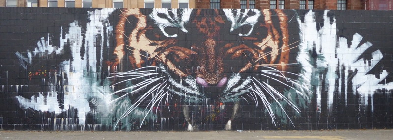 I then cut through St Enoch Square onto Clyde Street for a photograph of James Klinge’s largest piece, a fierce tiger facing onto the river, I first photographed this mural in 2015 as part of a camera course, and at that time we had a model dressed as an assassin, we certainly got some strange looks from passersby.