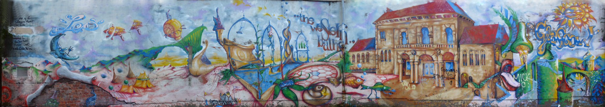 Leaving the station area and strolling through the park leads to another of Smug’s works, stretching the length of the wall from the station to Gibson Street, a 90-metre long mural, created in 2009, with Smug designs by children at three nearby schools. The amazing work represents the history of Scottish transport, from the past to the present. Due to its age, this piece is starting to fade and looks a bit tired now.