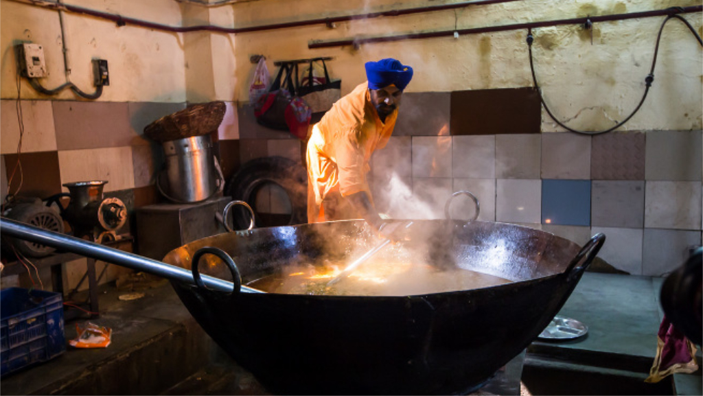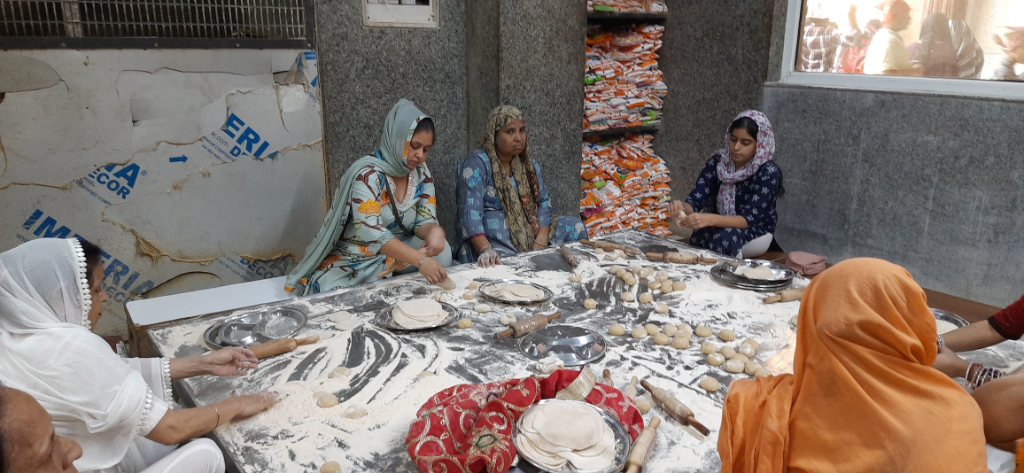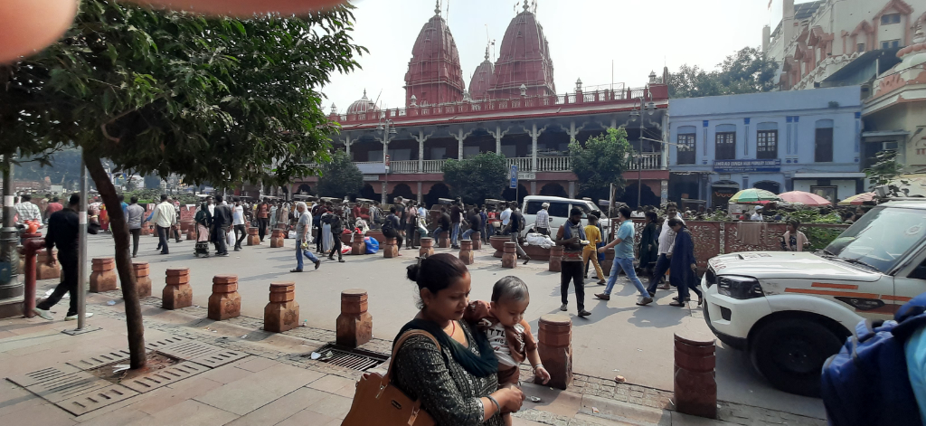 To really get a feeling for the area, Shakti negotiated for a fleet cycle rickshaw to take us down Chandni Chowk Road towards the Gurdwara Sis Ganj Sahib Sikh Temple, again, this was a fascinating place to visit. After a short briefing about the customs to be observed, we removed our shoes and socks, covered our heads then entered the temple to hear the prayers being carried out. Following that part of the process we then visited the kitchen where volunteers were performing a service, by preparing and cooking vast amounts of food – pumpkin, dal, and roti for anyone who wanted to enter the temple to eat, the pots and pans making Dahl were enormous, and the bakers and women making the roti were working continuously. With a culture like that, no one ever needs to go hungry, which is surprising when you see beggars on the streets asking for money for food.