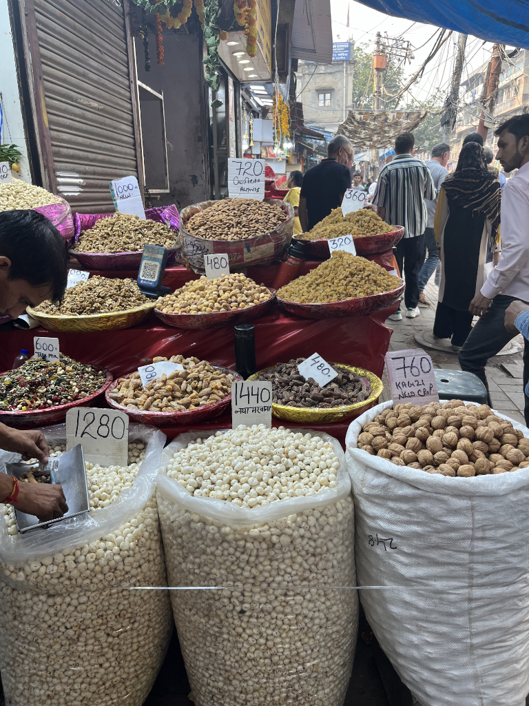 On returning to the streets of Old Delhi, Shakti took us through the narrow lanes and alleyways of Chandni Chowk, the bazaar and the old spice market, we were hit with the sight, sounds, and more importantly, the smells of the many spices, some of the group found the scent of the red chillies to be overpowering. Despite it being the Diwali holiday season, a good quantity of the shops and stalls were open, giving us a real feel for the area, I especially liked the market trolleys hand painted for Diwali.