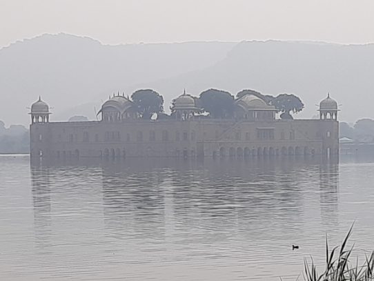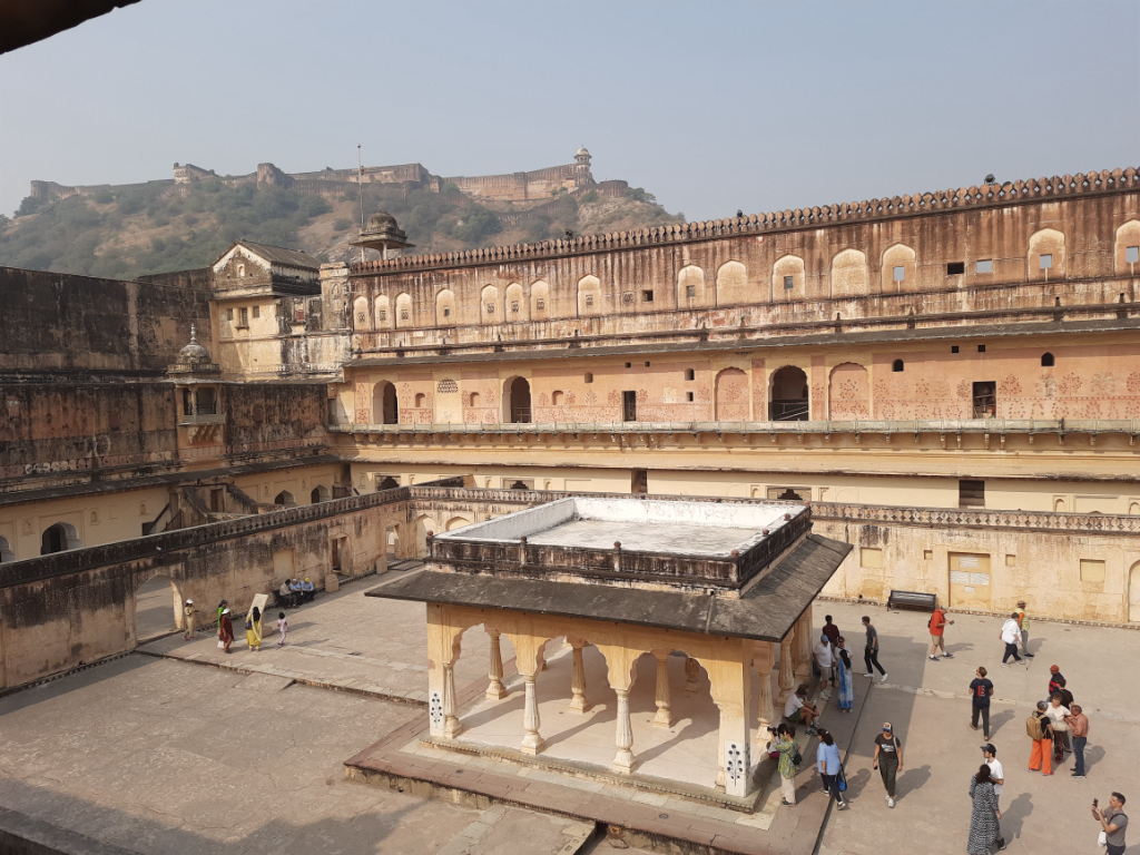 In the morning we got on our bus and headed up into the hills to visit the Amber Fort. Amber’s Fort’s buildings are less impressive than those at Jaipur, but the natural setting is unforgettable. We visited Amber early in the day mainly to avoid the big coach parties; but we missed the evening sound-and-light show from the lakeside Kesar Kiyari complex in Maotha Lake, below the fort.