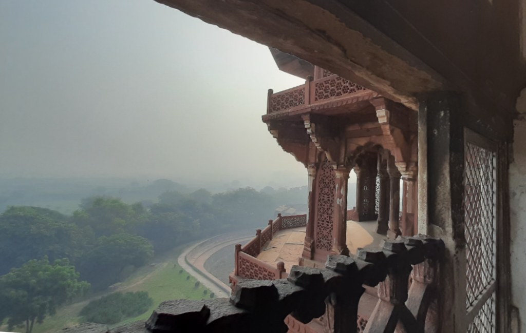 Before leaving Agra, we paid a visit to the Agra Fort, this impressive Moghal fort was built between 1565 and 1573, as the stronghold of the Mughal Empire. Akbar commissioned the walls and, his grandson, Shah Jahan, had most of the principal buildings erected, and Aurangzeb, the last great emperor, was responsible for the ramparts. The curved sandstone bastions reach a height of over 20m and stretch for around two and a half kilometres, punctuated by a sequence of massive gates. Our local tour guide, Mr Selim, was most entertaining and informative as he took us on a tour of the sights, he was also a good photographer, taking some special pictures of the ladies in our group. It was very misty when we were there, we should have been able to see the Taj Mahal in the distance but it was fully obscured. Fortunately, the mist cleared for us on our visit the day before.