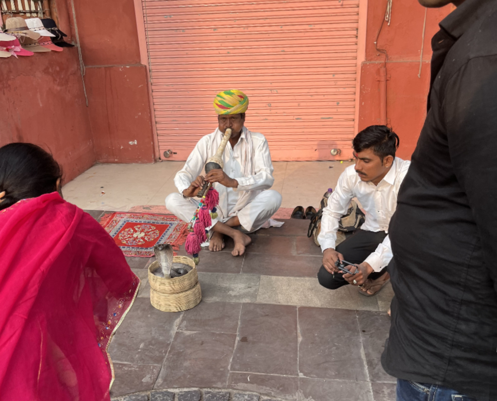 After lunch, we went, as a group, on a walking tour of the city, with Shakti pointing out the sights of the Pink City and its beautiful terracotta city walls and gates, One of the highlights of the city is the Hawa Mahal, aka the Palace of Winds. Still in the city, we were taken through the bazaars and busy markets, our trip was interesting watching the snake charmers and high-wire acrobats performing, plus a passing visit to the many local undertakers added to the experience. before taking a Tuk-Tuk ride to a gemstone factory, this collective, which supports rural village workers was a fascinating place, showing us how precious and semi-precious stones are cut and polished. Jim, amongst some others from the group, made some purchases. Following this we went to Dagla, a rooftop bar and restaurant for dinner, it was nice to see and hear all the Diwali lights and fireworks.