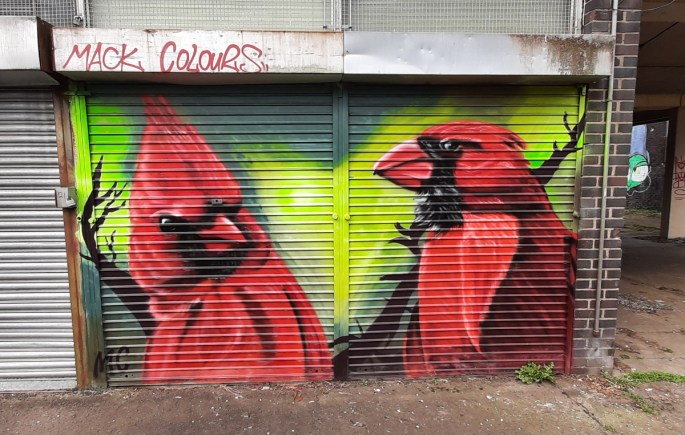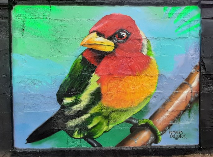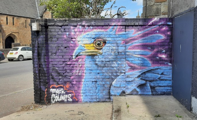 April of 2021 saw the commencement of The Shawlands Art Trail, This project, organised by My Shawlands, was been assisted by Gaz Mac from SWG3’s Yardworks Project, and brought many of Glasgow’s talented street artists to the southside to add some much-needed colour to the area, and as expected Mack Colours was there to add some of his birds of paradise.