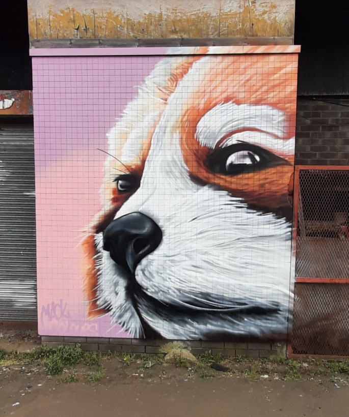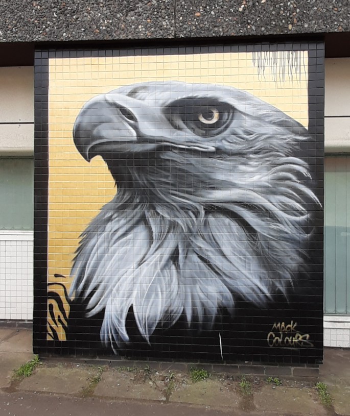 This is a series of murals of exotic birds, and some other animals painted on the walls of the almost derelict Shawbridge Shopping Arcade, mainly on Ashtree and Greenview Streets in the Pollockshaws area of Glasgow. These images were added in late March 2022, there are also some nice pieces by Mack Colour’s long-time collaborator Frodrik, also in the location is a panel by Mul, a street artist from Newcastle who was on a visit to the city, there are also some by other local artists, (see The Bird Man of Shawlands post in my blog for more information on the location)