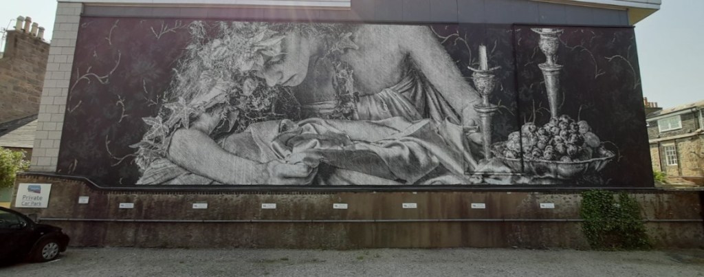The theme of this year’s festival is Rewilding, a fairly topical theme as we try to regain our space and recover from industrial decline. As we had the time this year, we thought we would sit in on some of the Nuart Plus programmes, our first one was the Fight Club in the Spin Pub on Littlejohn Street, this was a lively affair with two sides arguing over the topic ‘Is professionalisation killing art…’, it was all good fun and the beer was OK too. On Saturday afternoon we visited the Art Gallery to hear an interesting talk by Aida Wilde on her contribution to the festival and how she worked with students from three Aberdeen secondary schools – including young refugees who have fled war-torn Afghanistan and Ukraine – to create a stunning mural for Nuart Aberdeen 2023, unfortunately, her time ran short before she could finish her talk, we would have liked to hear more. Our next session was again an interesting one with a discussion by KMG, Snik, Eloise Gillow and Tamara Alves, it was good to hear them speak with such passion about their work.
