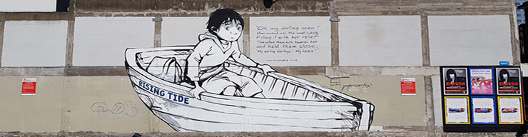 A collection of panels by Hayley King (AKA Flox), spelling out ‘No Place Like Home’ adorns 12 wall panels and 75 metres in Plymouth Lane.