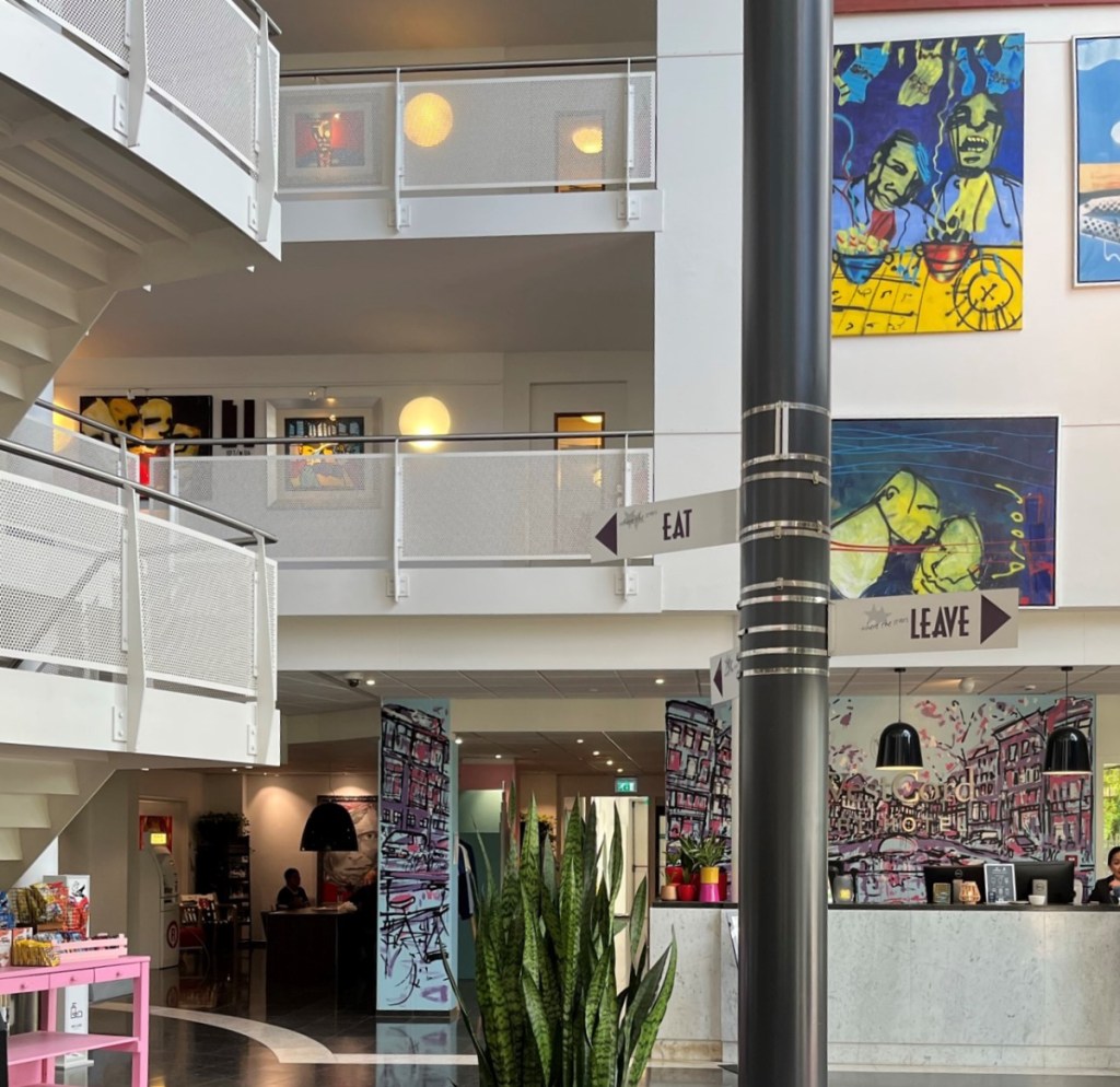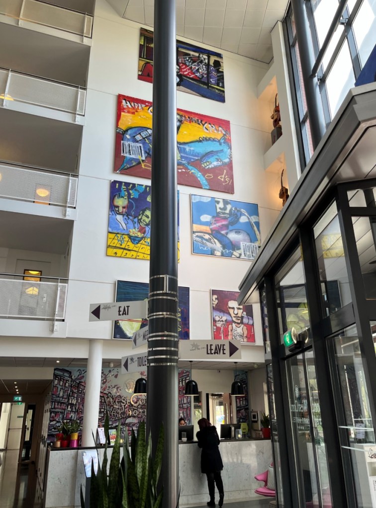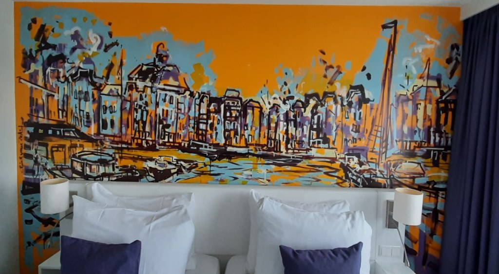 Monday 25th April An early start to get to the airport in plenty of time, however, due to a strike by baggage handlers at Amsterdam’s Schiphol Airport our flight was delayed. This gave us time to have a nice but rather expensive bacon roll and coffee in one of the airport bars. The flight eventually took off around 2½ hours late. Once in Amsterdam, it was easy to make our way to the Central Railway station to catch a train into town, and then a number 22 bus took us directly to our hotel, the Westcord Art Hotel. In keeping with the street art vibe of our Amsterdam visit, this hotel suited us down to the ground, with murals all over the foyer and staircases and an individual mural in each room