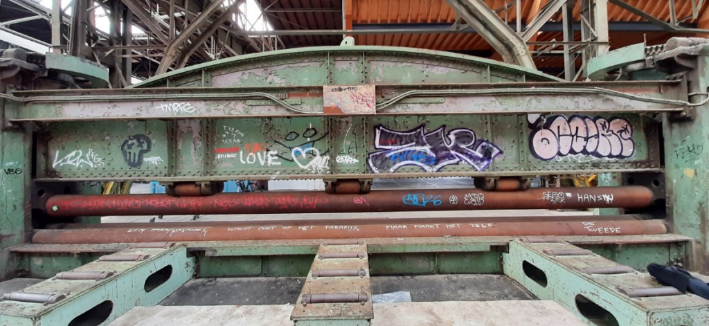 Everyone we had spoken to told us that today was special and was going to be a bit crazy, we were told that we should visit NDSM, an old industrial shipbuilding area to the north of the city to get away from the crowds, so off we headed to the central station to catch one of the free ferries across, it looked exactly as described, old machine shops and slipways, there was even some old machinery left, it was interesting that in one of the shipbuilding sheds there was an old plate roller built by the Scottish Machine Tools Corporation, I company I worked in when I first came ashore. The area has been turned over to street artists and there is even STRAAT, a museum dedicated to it in one of the buildings, we decided to leave off visiting for a day when we had more time.