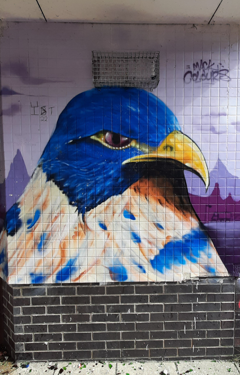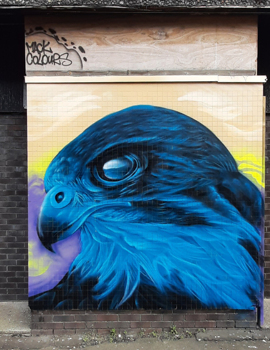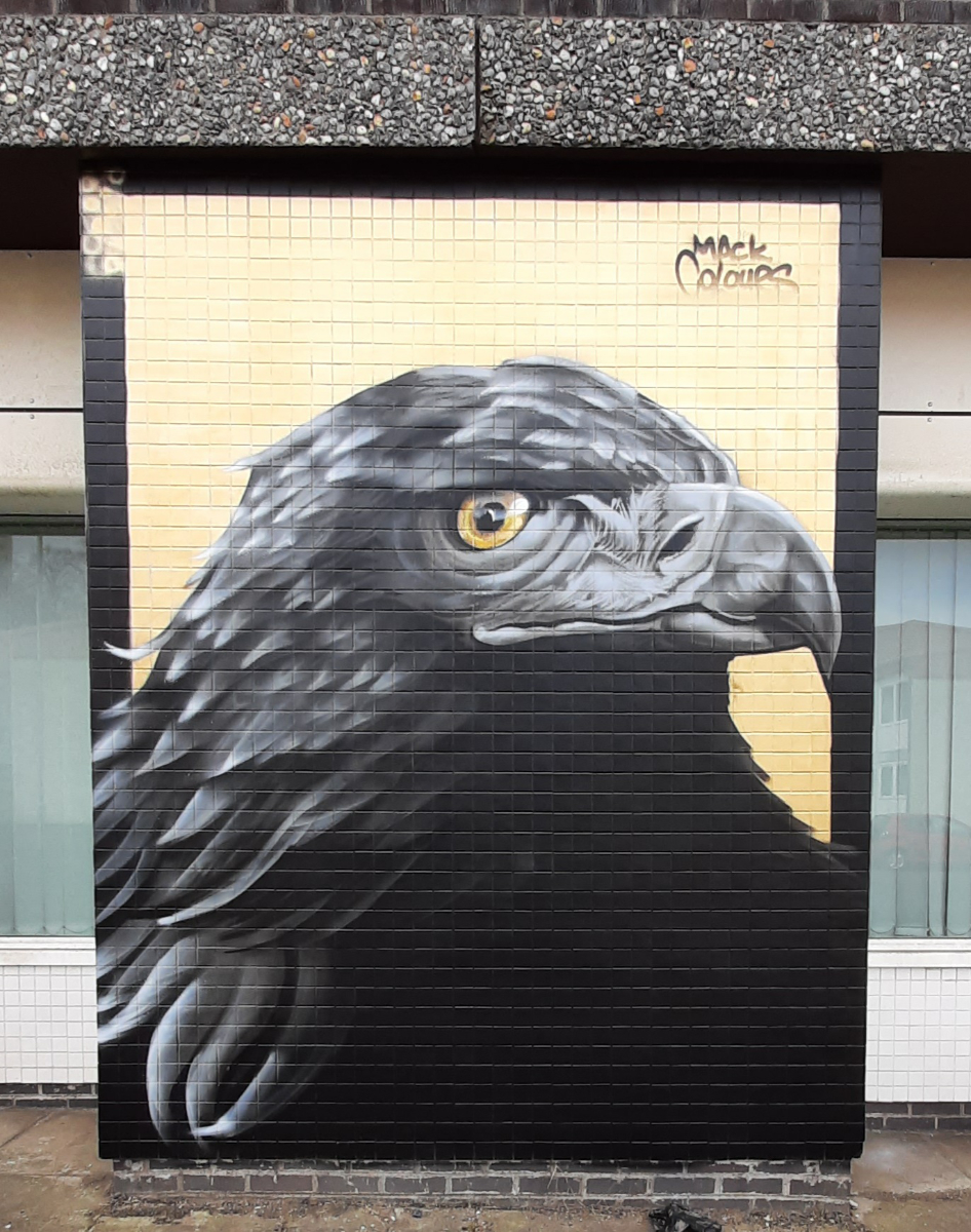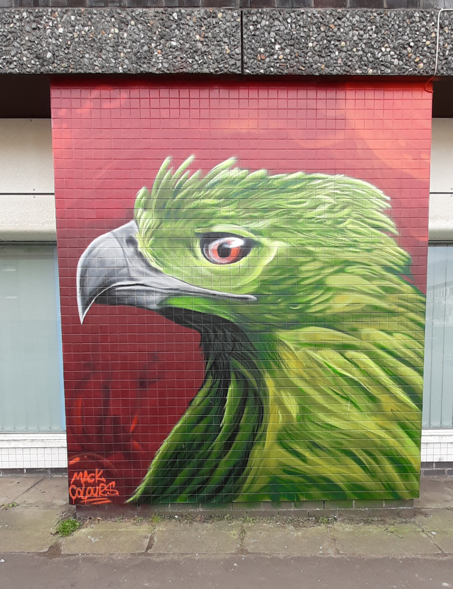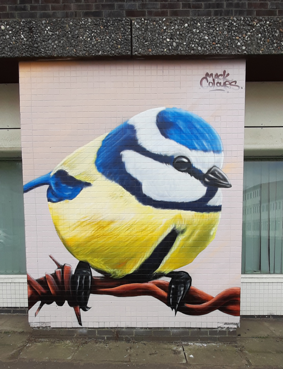 The next stop on our route was Crossloan Road where the next 3 murals are close to each other. KMG’s The Flock is built around the themes of migration and new families arriving in Glasgow and depicts two birds cradling their young.