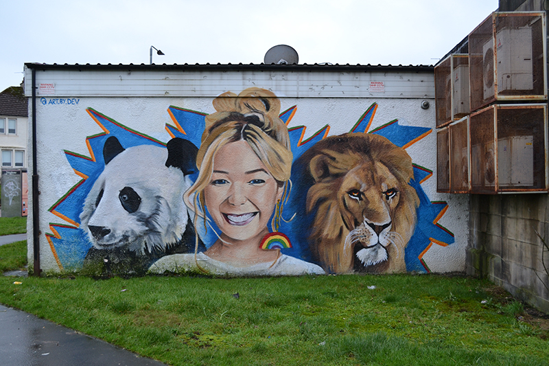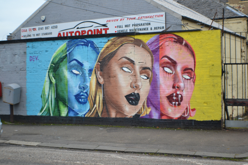 Graffiti artist Shaun Deveney from Paisley, known as Art by DEV, has many excellent murals around his home town. So far I have taken photographs of only 8 of his works, but look forward to photographing many more. On his Facebook and Twitter feeds, Shaun has displayed many of his works in Paisley, Glasgow and elsewhere around the globe, he also comments on how he is still experimenting with his technique and developing skills with colours and backgrounds. I look forward to seeing the results.